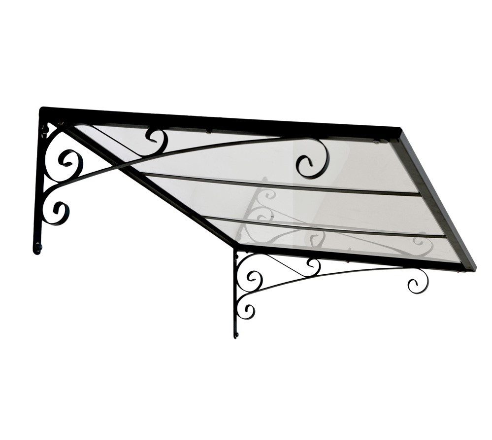 Extrem stabiles Vordach in ansprechendem Design. Besonders elegant sind die beiden spiralförmigen Träger an den Seiten. Eine massive Konstruktion aus