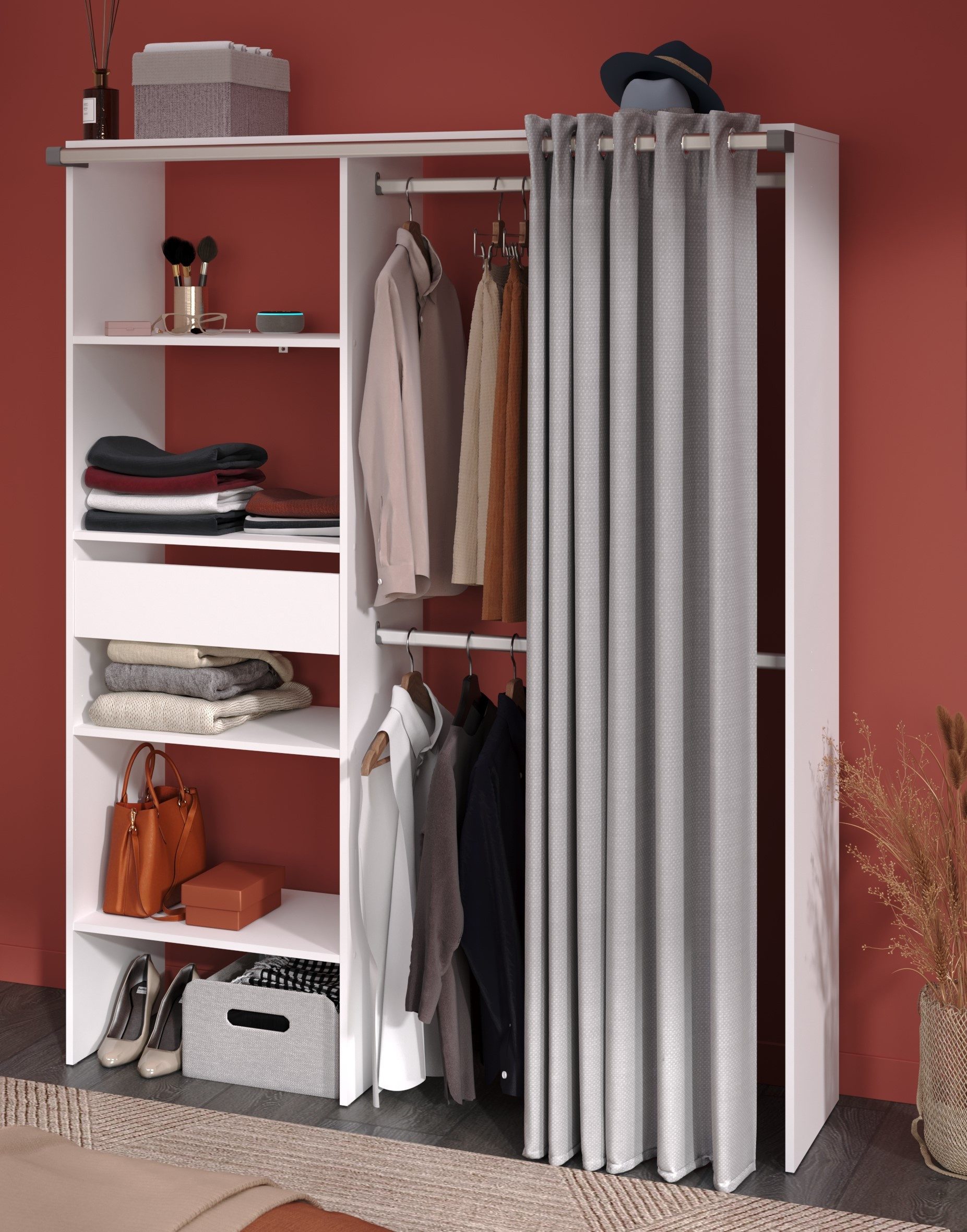 Ein besonderes Highlight ist der Vorhang aus 100 % Polyester in stilvollem Grau/Anthrazit, der an robusten Ösen aufgehängt ist und als moderne Alternative zur klassischen Tür dient – ideal für schnellen Zugriff auf Kleidung und Accessoires.