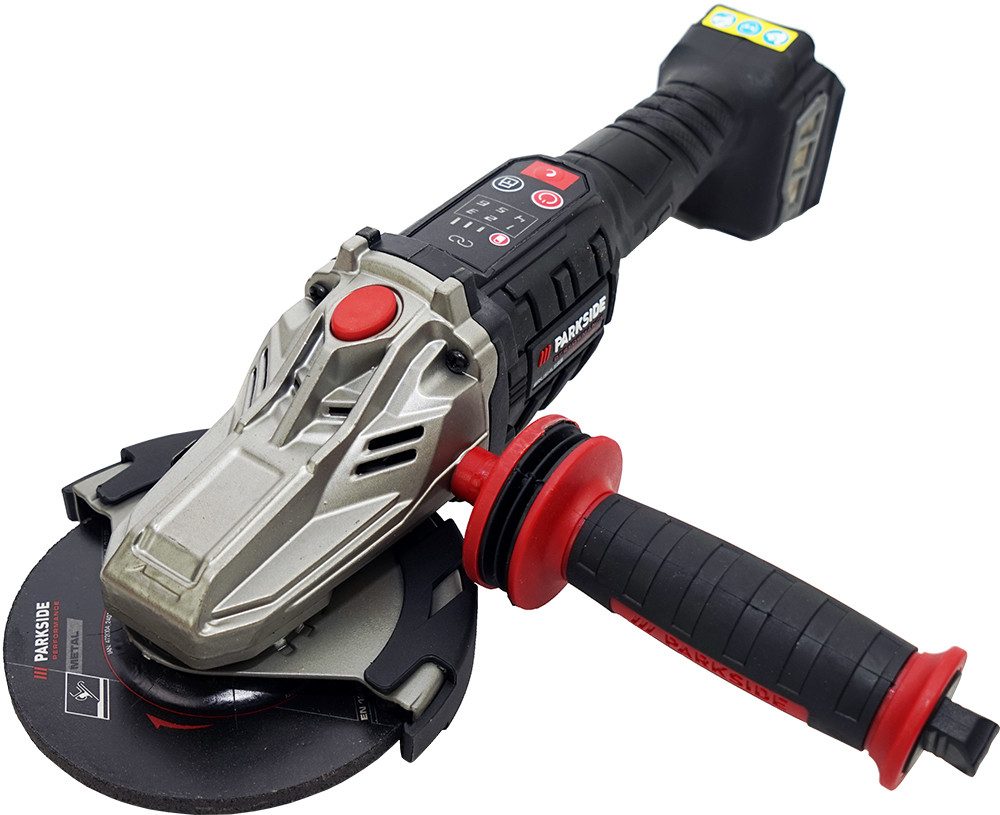 Lieferumfang | Zubehör: 1x Schruppscheibe für Metall (vormontiert), 1x Frontgriff (vormontiert), 1x Spannschlüssel (im Zusatzhandgriff verstaut), 1x 2-in-1-Schutzhaube (vormontiert) |