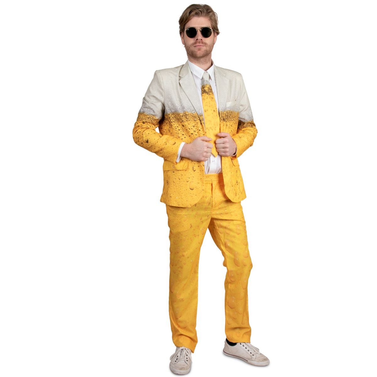 Hier kommt der ultimative Bierkönig Fabsi Anzug – das perfekte Outfit für alle, die den Dresscode „Leichter Bieranzug“ wörtlich nehmen wollen! Ob bei Fasching, Karneval, Oktoberfest, Ballermann oder dem nächsten Männertag – in diesem goldgelben Anzug bist du der unangefochtene König des Biers. Das Jackett mit aufgesetzten Taschen strahlt in edlem Gold und wird von einer fluffigen Schaumkrone im oberen Bereich gekrönt, die jedem zeigt, dass du in Sachen Bier Geschmack hast.