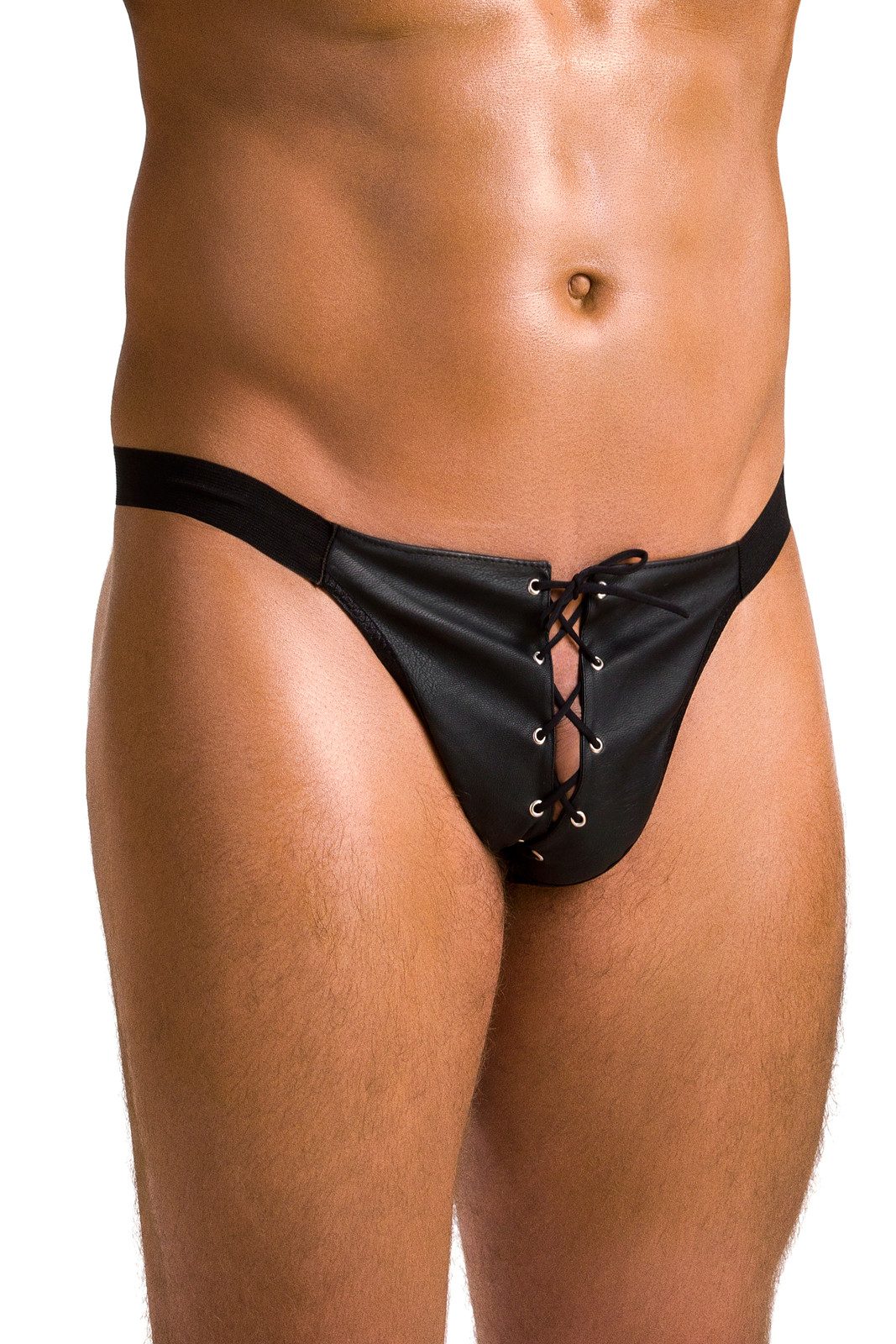 Schwarzer Herren Dessous Slip gefertigt aus mattem Kunstleder und breitem Gummiband. Schnürung auf der Vorderseite durch ein Gummiband in Metallösen.