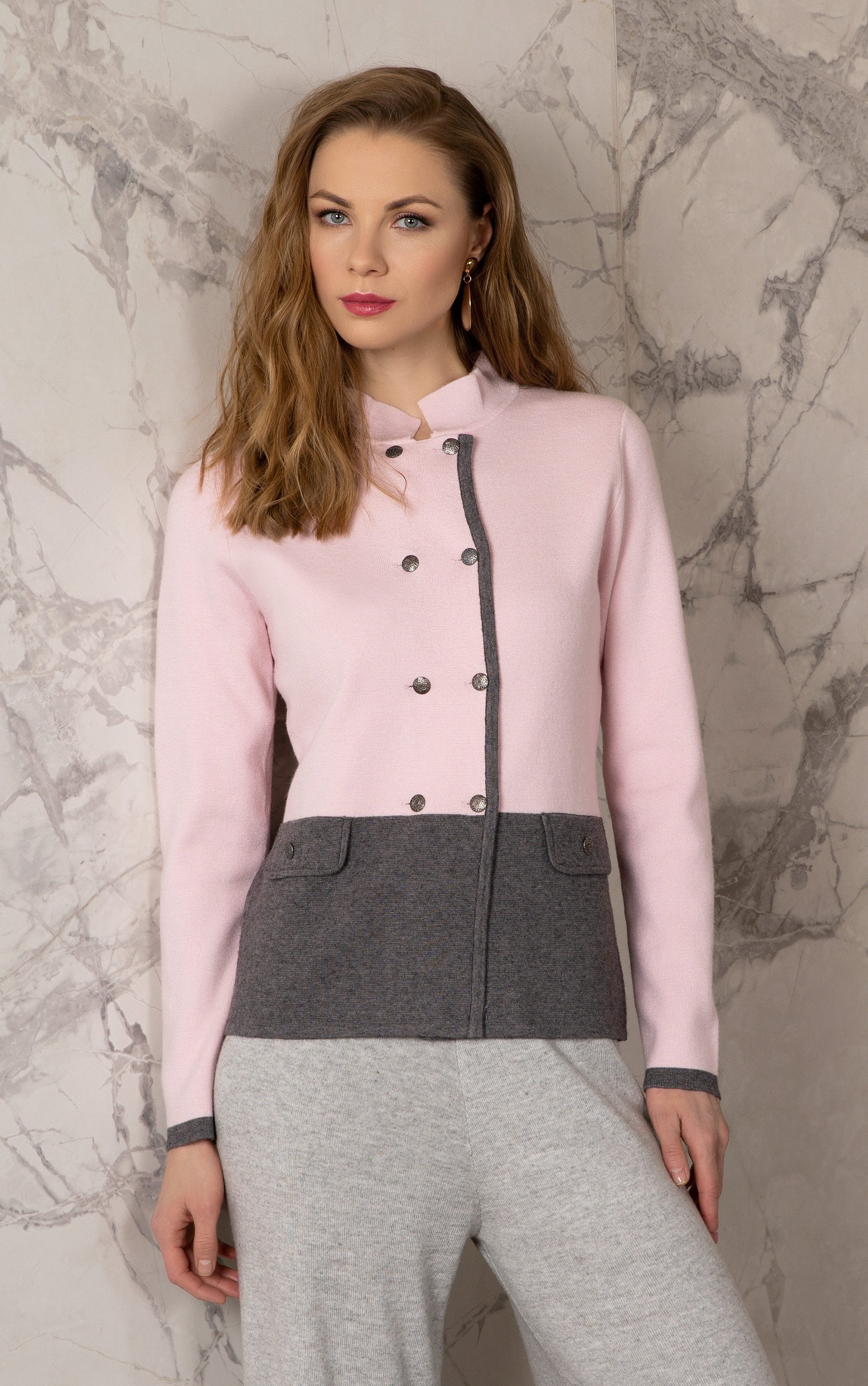 Dieser zweireihige Cardigan von Passioni in Hellrosa und Grau vereint Eleganz mit Gemütlichkeit. Die harmonische Farbkombination schafft einen stilvollen und sanften Look, während der hohe Kragen zusätzlichen Schutz und eine elegante Silhouette bietet. Mit dem klassischen zweireihigen Schnitt und den zwei Vordertaschen ist dieser Cardigan sowohl funktional als auch dekorativ. Er ist ideal für besondere Anlässe sowie für den Alltag, wo er sowohl Eleganz als auch Komfort bietet. Der Cardigan ist perfekt, um Ihrem Outfit einen Hauch von Raffinesse und Wärme zu verleihen.
