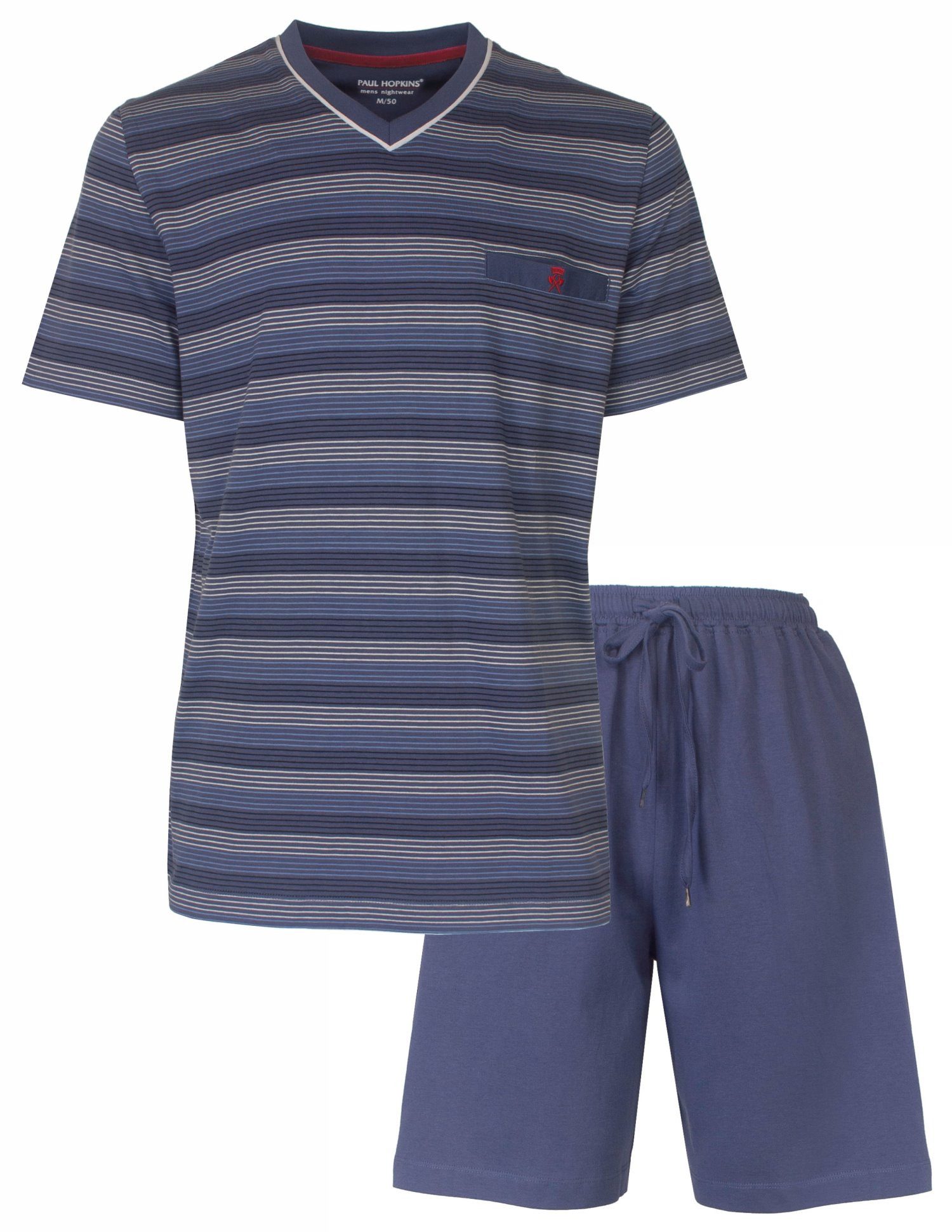 Dieser hochwertige Paul Hopkins Herren-Schlafanzug Shorty vereint zeitlosen Stil und höchsten Tragekomfort. Gefertigt aus 100% reiner Baumwolle, bietet er ein angenehm weiches Hautgefühl und sorgt für eine optimale Atmungsaktivität. Das Oberteil ist mit einem klassischen V-Ausschnitt gestaltet, der dem Shorty eine schlichte Eleganz verleiht. Eine praktische Brusttasche auf der linken Seite rundet das Design ab. Die dazugehörige kurze Hose ist mit einem elastischen Gummizug ausgestattet, der eine bequeme Passform garantiert. Der zusätzliche Tunnelzug am Bund ermöglicht eine individuelle Anpassung, sodass der Schlafanzug stets angenehm sitzt, ohne einzuengen. Durch die hochwertige Baumwollverarbeitung ist der Schlafanzug nicht nur besonders hautfreundlich, sondern auch pflegeleicht und strapazierfähig. Mit seinem legeren, aber dennoch stilvollen Design ist dieser Herren-Schlafanzug Shorty die ideale Wahl für alle, die Wert auf Komfort und einen modernen Look legen. Ob für laue Sommernächte oder als gemütliche Freizeitbekleidung – dieser Shorty bietet das perfekte Zusammenspiel aus Funktionalität und Stil.