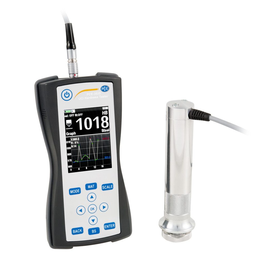 Das UCI Härtemessgerät PCE-3500 dient der zerstörungsfreien Härtemessung von metallischen Bauteilen. Das UCI Härtemessgerät arbeitet nach dem Ultrasonic-Contact-Impedance Verfahren. Bei dem UCI-Verfahren wird ein Vickers-Diamant an der Prüfsonde mit Eigenresonanz angeregt. Durch Aufdrücken der Prüfsonde wird die Schwingfrequenz je nach Härte der Oberfläche und in Abhängigkeit vom E-Modul des Werksoffes und der Kontaktfläche gedämpft. Aus der sich ergebenden Frequenzverschiebung kann unter Berücksichtigung einer Werkstoffkennlinie die Härte der Oberfläche ermittelt werden.