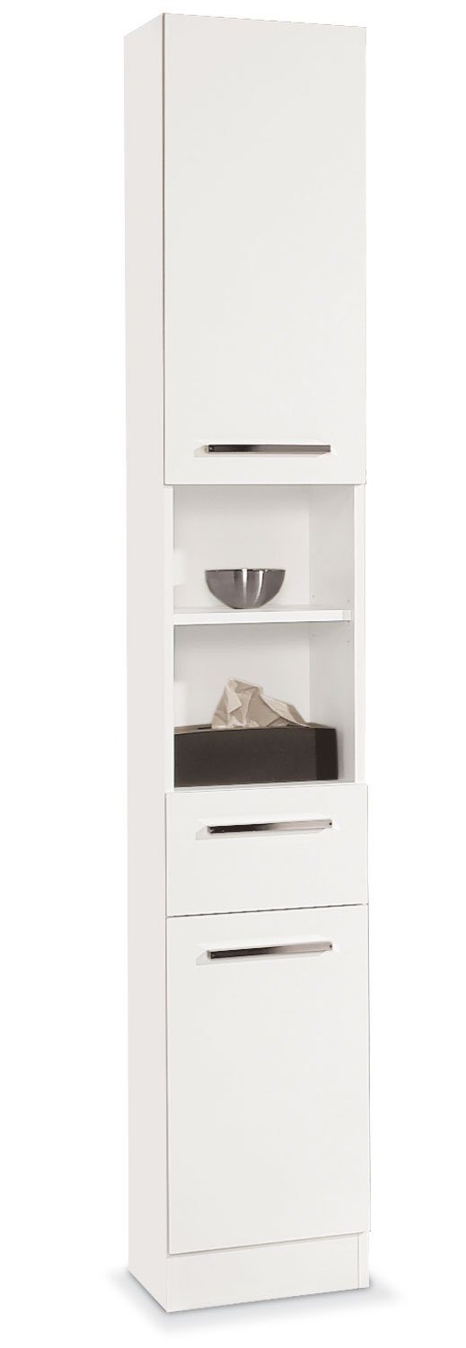 Lieferumfang | 1 Hochschrank mit 2 Türen, 1 Schublade, 2 offenen Fächern und 3 Einlegeböden. Die Einlegeböden sind 3-fach in der Höhe verstellbar |