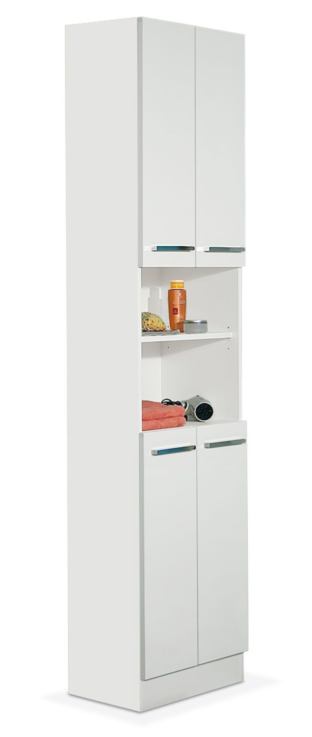 Lieferumfang | 1 Hochschrank mit 4 Türen, 2 offenen Fächern und 3 höhenverstellbaren Einlegeböden |