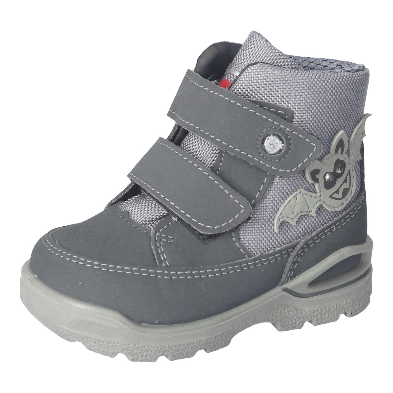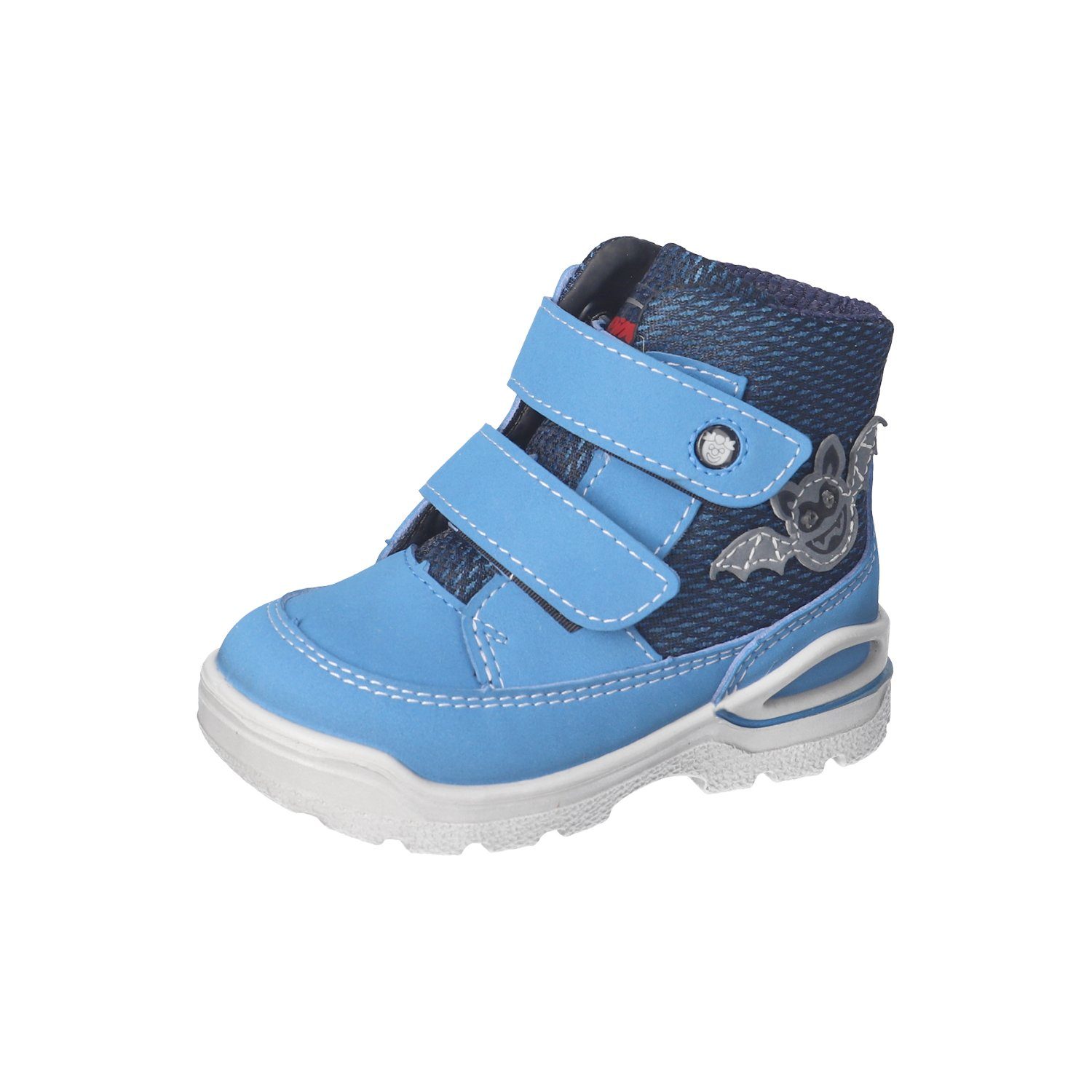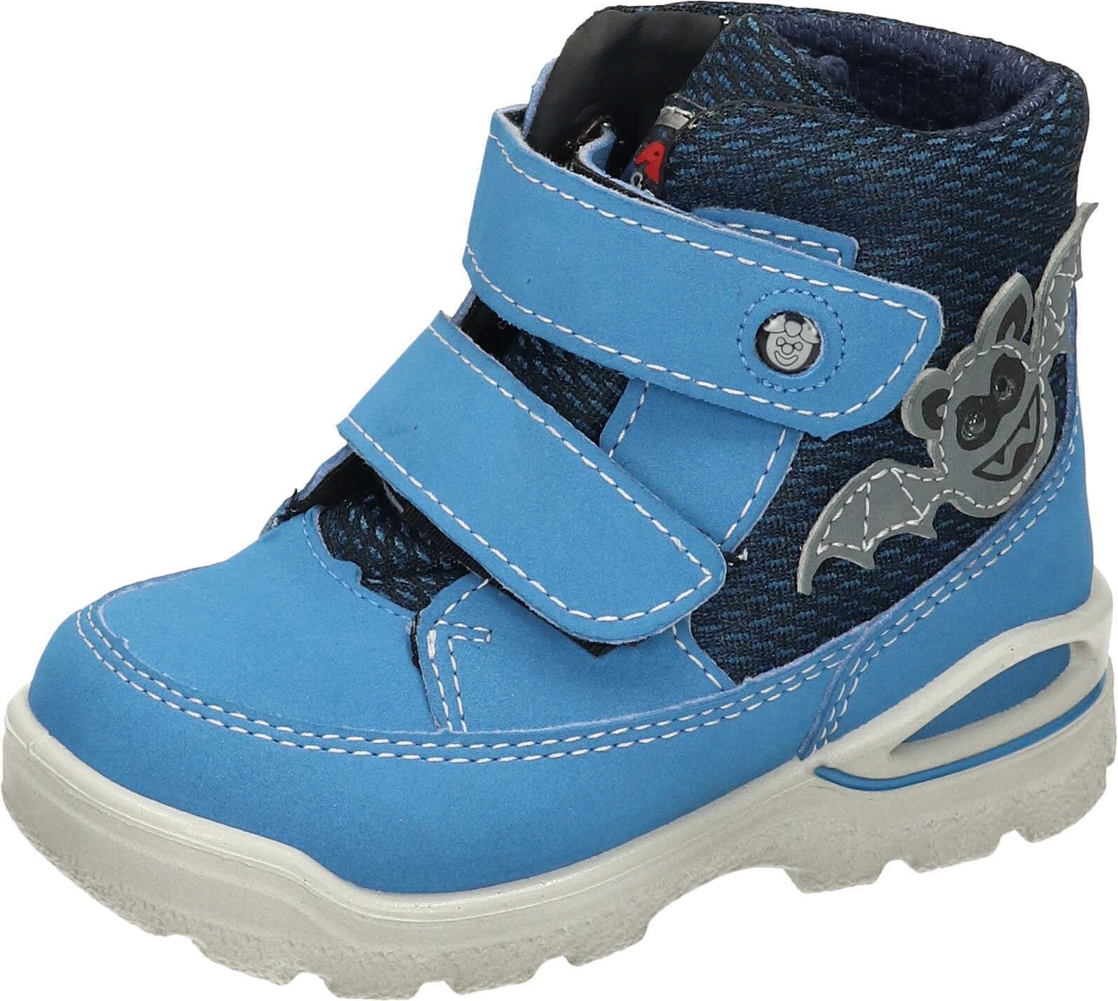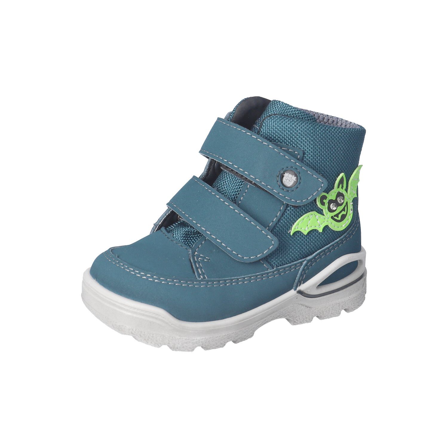 Die blauen Pepino Kinder Winterstiefeletten sind aus einem Textil-Synthetik-Mix gefertigt und bieten wasserfeste sowie atmungsaktive Eigenschaften dank Sympatex. Diese Lauflernschuhe sind mit zwei Klettriemen ausgestattet, die eine einfache Handhabung ermöglichen. Eine seitliche Comic-Spinne mit blinkenden Augen (nicht schaltbar) verleiht den Stiefeletten einen spielerischen Akzent. Der gepolsterte Einstieg und der verstärkte Fußrahmen sorgen für zusätzlichen Komfort und Stabilität. Das weiche Lammwollfutter hält die Füße warm, während die flexible, rutschhemmende Laufsohle für sicheren Halt sorgt. Diese Winterstiefeletten sind in der WMS-Schuhweite Weit erhältlich.