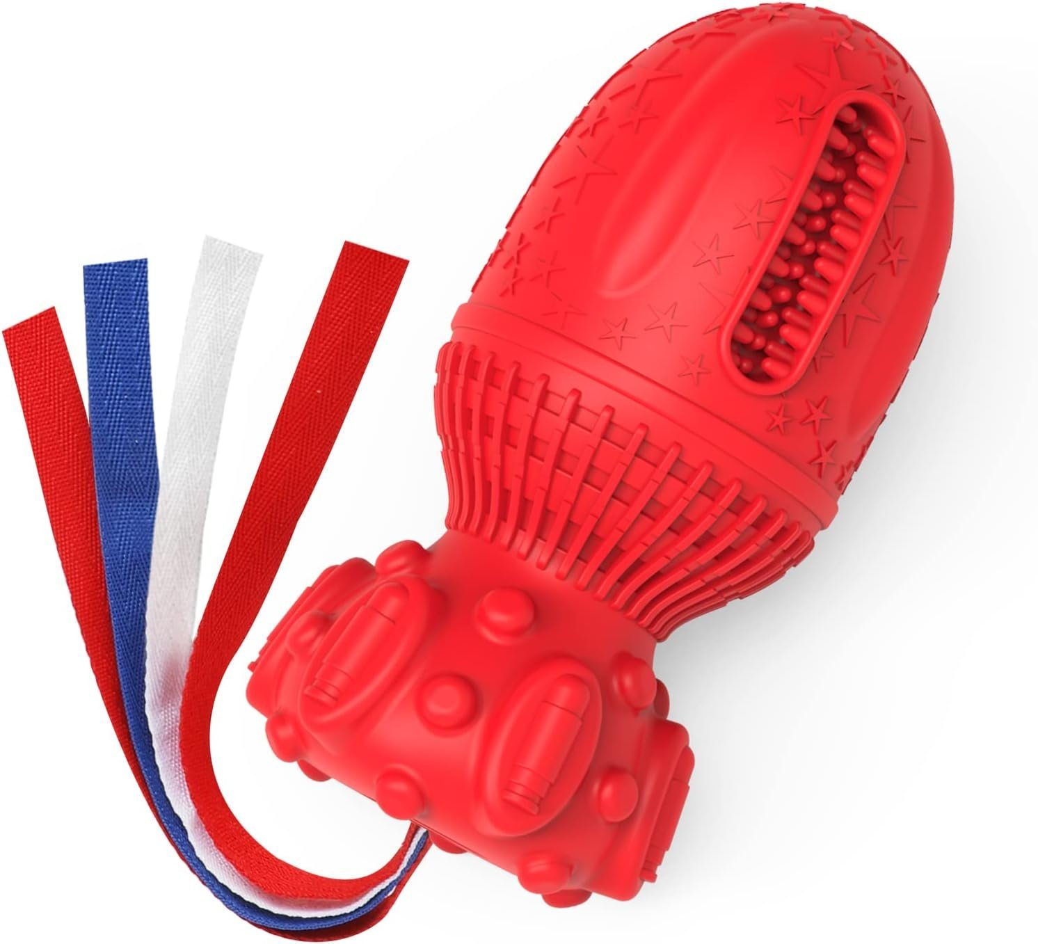 LANGLEBIG & SCHWER STÖRBAR - Dieses Hundekauspielzeug für mittlere und große Hunde ist sehr gut zum Kauen geeignet. Es ist aus hochwertigen und ungiftigem Naturkautschuk hergestellt. Es ist schwer durch Ihren Hund zu zerstören. 100% NATUR - Das Hundespielzeug ist absolut ungiftig und 100% Natur hergestellt. Das Material ist Naturkautschuk und somit das perfekt Spielzeug für Ihren Hund. QUIETSCHT & ZAHNREINIGUNG - Diese Spielzeug regt Ihren Hund durch ein eingebautes Quietschgerät zum spielen an. Die Oberfläche des Kauspielzeugs kann die Zähne von Ihrem Hund reinigen, Plaque abschleifen und Zahnstein lösen. Durch das Kauen werden die natürlichen Triebbedürfnisse Ihres Hundes befriedigt. Es kann Ihrem Hund z.B. bei langeweile, Gewichtsmanagement, Zahnpflege oder dem Lösen von Problemen helfen. WASSERFEST & INTERAKTIVES HUNDESPIELZEUG - Das spielen mit dem Hundespielzeug kann das Vertrauen und die Bindung zu Ihrem Hund stärken. Es hilft Ihrem Hund Druck abzubauen und stärkt die Beziehung zwischen Ihnen und Ihrem wunderschönen Hund. ?! – Sollten Sie nicht zu 100,0 % zufrieden sein, dann können Sie es innerhalb von 30 Tagen kommentarlos zurückschicken und Sie erhalten Ihr Geld wieder. Ohne Wenn und Aber!