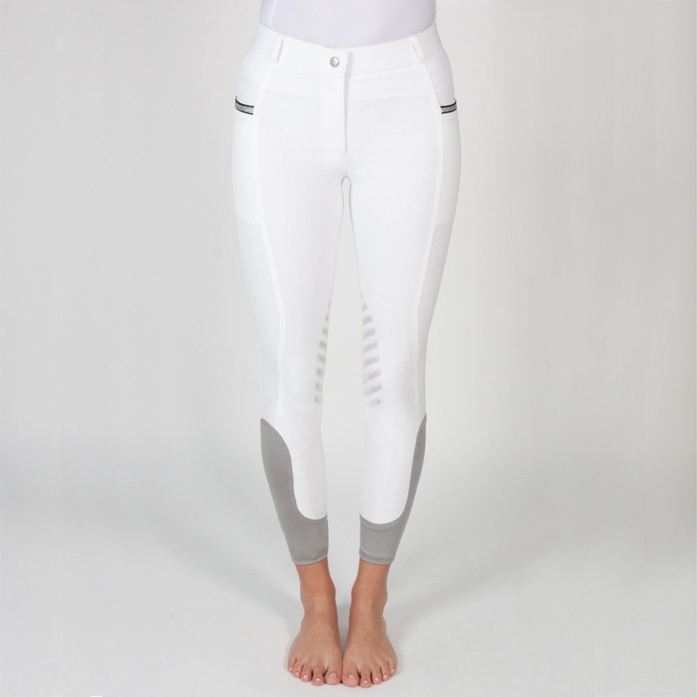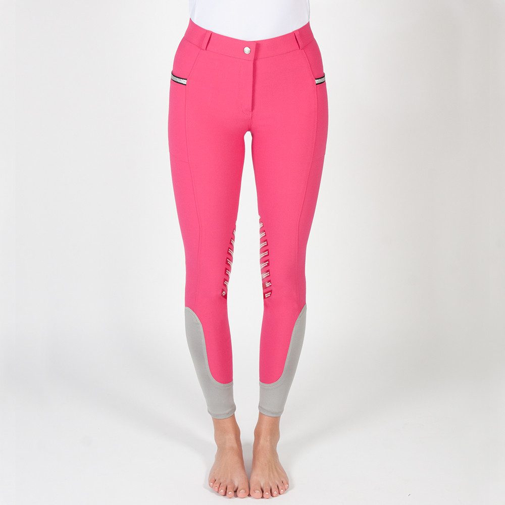 Moderne und bequeme Reiterhose aus hochwertigem Baumwoll-Microfaser-Material. Neben einem Kniebesatz aus silikonähnlichem Druck verfügt diese Reithose über zwei große, verzierte Einschubtaschen an den Oberschenkeln. Diese eignen sich hervorragend für verschiedenste Handy-Modelle. Zusammen mit weiteren, farblich abgesetzten Details, wie kleinen Logo-Stickereien und dem elastischen Beinabschluss, wird diese Reithose zum idealen Begleiter im Stall und auf dem Turnier. Ihr Obermaterial besitzt einen hohen Baumwoll-Anteil, der für ein angenehmes Tragegefühl auf der Haut sorgt. Durch die zusätzlich verwendeten Microfasern entsteht die nötige Elastizität, mit der sich die Reithose jeder Bewegung anpasst. Farben: weiß-grau (115), mittelblau (127), pink-grau (222). Größen: 34, 36, 38 ,40, 42, 44, 46, 48, 50. Material: Obermaterial 67 % Baumwolle, 25 % Polyamid, 8 % Elasthan / elastische Beinabschlüsse: 90 % Polyester, 10 % Elasthan. Waschbar bis 30°C, bitte auf links waschen! Ein Qualitätsprodukt von PFIFF