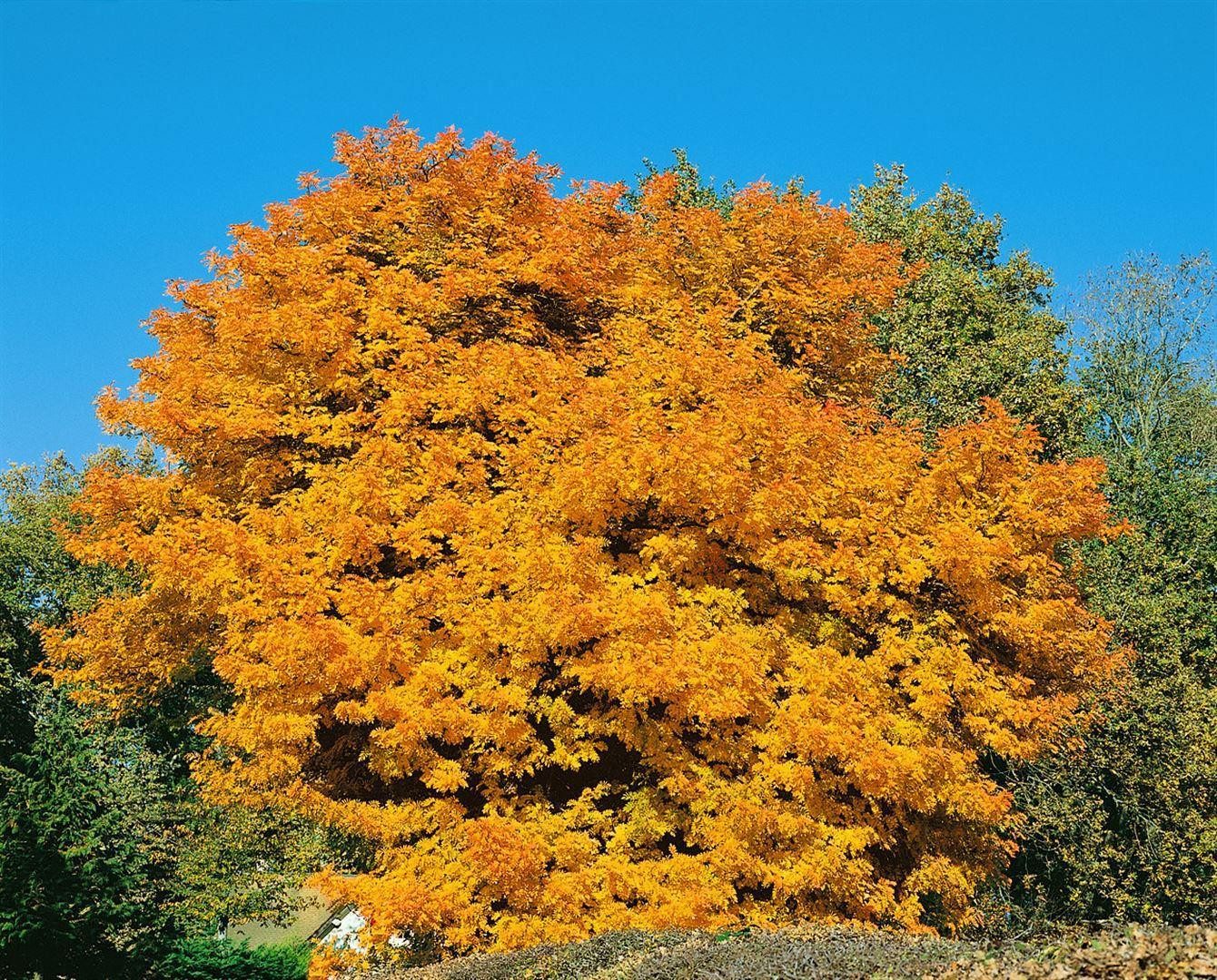 Er traegt cremeweisse Blueten im Mai und Juni und hat gefiederte Blaetter mit leuchtender Herbstfaerbung