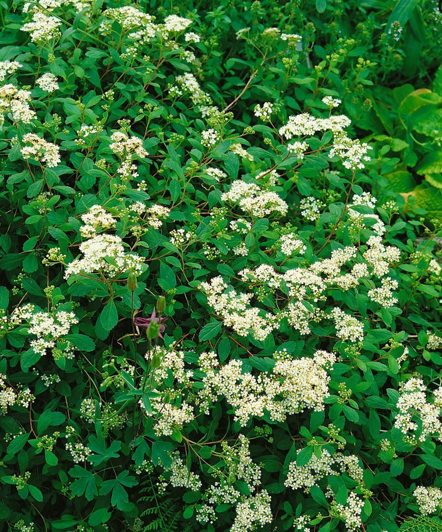 Reichbluehende Spiraea decumbens mit weissen Schirmrispen im Mai bis Juni zartes frischgruenes Laub dezente Herbstfaerbung