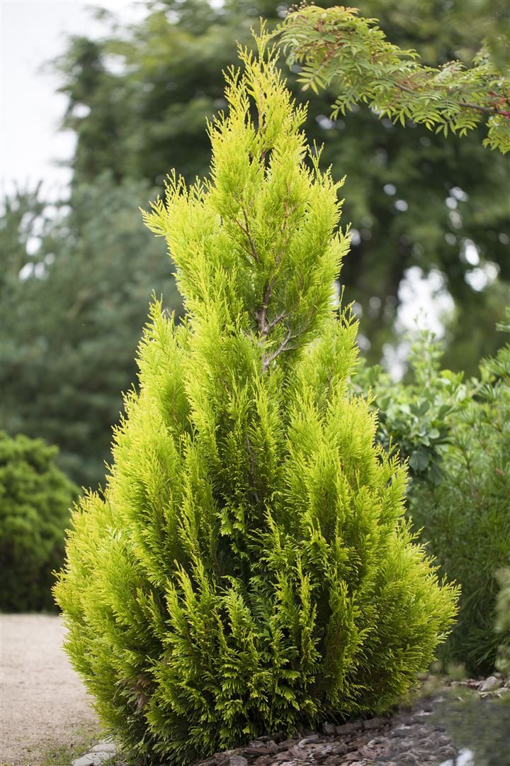 Thuja plicata 4ever Goldy mit leuchtend goldgelbem ganzjaehrig attraktivem Schuppenlaub