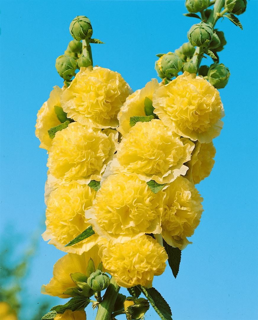 Alcea rosea ‘Pleniflora Chaters’ Gelb, die klassische Garten-Stockrose, präsentiert sich als imposante Blütenstaude mit dicht gefüllten, rosettenartigen Blüten in warmem Zitron- bis Schwefelgelb. Von Juni bis September steigen die kerzenförmigen Blütenstände an hohen, straffen Stielen empor und setzen in Bauerngarten und Cottagegarten ebenso prägnante Akzente wie im repräsentativen Vorgarten. Das rundlich gelappte, leicht behaarte Laub bildet den idealen Kontrast zur üppigen, mehrreihigen Blütenpracht, während der aufrechte, schlanke Wuchs diese Malve zum perfekten Hintergrund im Staudenbeet macht. Als Solitär an Hauswänden, Zäunen und Mauern oder in Gruppenpflanzung hinter niedrigen Zierstauden entfaltet der Blütenstrauch-Charakter der Stockrose maximale Wirkung; in ausreichend großen Gefäßen eignet sie sich zudem als Kübelpflanze für sonnige Terrassen. Ein vollsonniger, warmer und möglichst windgeschützter Standort fördert die Standfestigkeit und Blütenfülle. Der Boden sollte tiefgründig, humos und nährstoffreich sein, zugleich gut durchlässig, damit keine Staunässe entsteht. Gleichmäßige Wasserversorgung in Trockenphasen sowie eine moderate Düngung im Frühjahr unterstützen den vitalen Austrieb. In exponierten Lagen empfiehlt sich ein Stützstab für die hohen Triebe. Regelmäßiges Ausputzen verblühter Rispen verlängert die Blütezeit, ein Rückschnitt nach der Blüte stärkt die Pflanze. Luftige Pflanzabstände und das Vermeiden langanhaltender Blattnässe wirken typischen Malvenproblemen entgegen. Kurzlebig bis ausdauernd wachsend, erhält sich diese Stockrose bei passenden Bedingungen durch Selbstaussaat und sorgt so Jahr für Jahr für eine romantische, gelb leuchtende Vertikalstruktur im Staudenbeet, am Zaun oder entlang lockerer Blütenhecken.