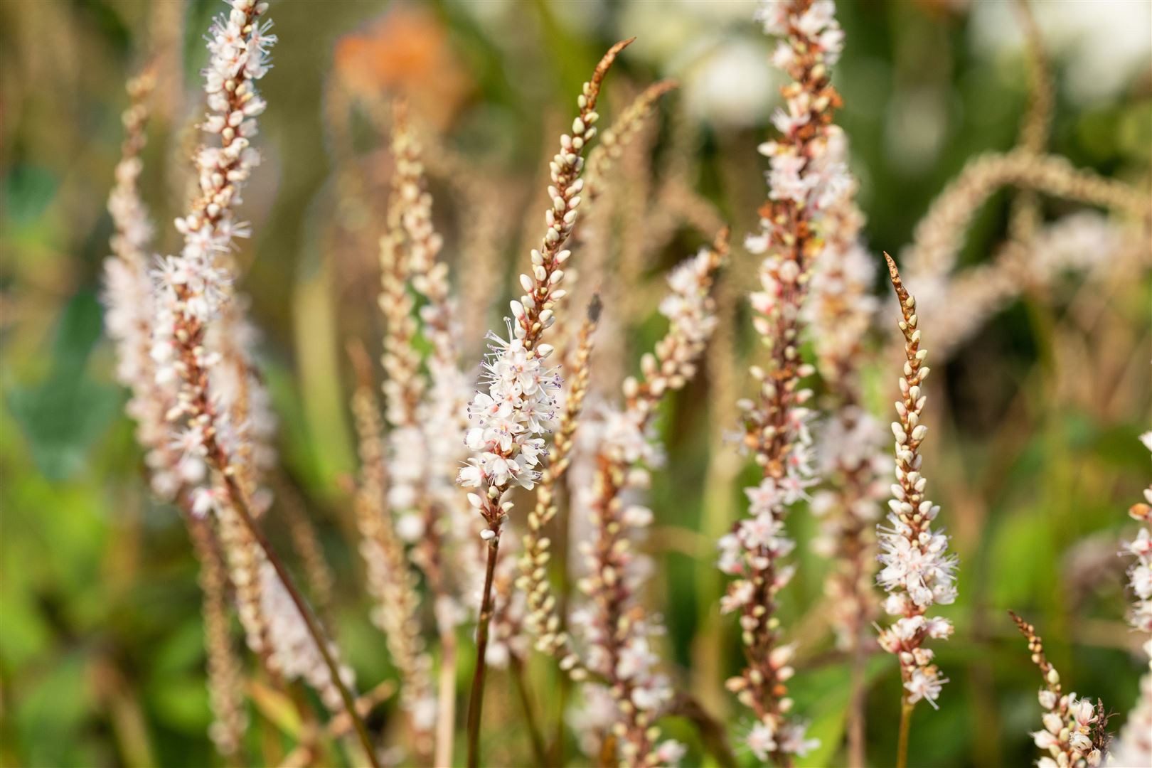 Bistorta amplexicaulis ‘Alba’, auch bekannt als Kerzenknöterich oder unter dem botanischen Synonym Persicaria amplexicaulis ‘Alba’, ist eine elegante Gartenstaude mit schmalen, reinweißen Blütenkerzen, die von Hochsommer bis in den Herbst hinein zuverlässig blühen. Die filigranen, aufrechten Blütenstände schweben über sattgrünem, lanzettlichem Laub und verleihen Beeten, Rabatten und dem Gehölzrand eine ruhige, edle Note. Der horstige, zugleich flächig verdichtende Wuchs sorgt für einen geschlossenen Bestand und eine harmonische Struktur im Staudenbeet, während die schlanken Blütenähren für vertikalen Akzent und dauerhafte Blütenpräsenz stehen. Als vielseitige Blütenstaude bewährt sie sich in naturnahen Pflanzungen, im Präriebeet, am Teich- oder Bachrand, in Gruppenpflanzungen sowie als zurückhaltender Solitär. Auch in einem ausreichend großen Kübel auf Terrasse oder Balkon entfaltet dieser Zierstauden-Klassiker seine Wirkung, wenn gleichmäßig gegossen wird. ‘Alba’ bevorzugt einen sonnigen bis halbschattigen Standort mit frischem bis feuchtem, humosem, nährstoffreichem und gut durchlässigem Boden; kurzzeitige Trockenphasen werden bei eingewachsenen Pflanzen toleriert, eine gleichmäßige Bodenfeuchte hält die Blüte jedoch besonders lang. Ein Rückschnitt im Spätwinter fördert den kompakten Neuaustrieb, gelegentliches Ausputzen sowie eine Düngung mit Kompost im Frühjahr unterstützen Vitalität und Blühfreude. Winterhart und langlebig, bietet diese Gartenstaude eine zuverlässige, pflegeleichte Option für anspruchsvolle Beetgestaltungen, gemischte Staudenrabatten und harmonische Übergänge zwischen Rasen, Hecke und Gehölz.