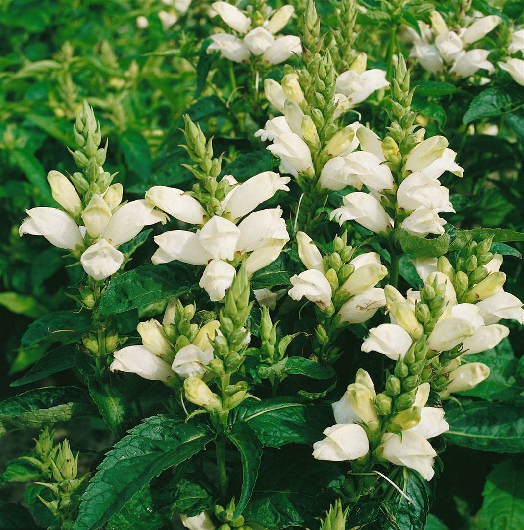 Chelone obliqua ‘Alba’, der weiße Schlangenkopf, ist eine elegante Blütenstaude, die mit ihren reinweißen, helmförmigen Blüten von Spätsommer bis in den Herbst begeistert. Die aufrecht wachsende Gartenstaude erreicht etwa 60 bis 80 cm Höhe und bildet dichte Horste mit kräftigen, standfesten Stielen. Das sattgrüne, lanzettliche Laub mit fein gesägtem Rand setzt einen frischen Kontrast zu den leuchtend weißen Blütenähren, deren rohrförmige Einzelblüten an kleine Schildkrötenköpfe erinnern. Als Spätblüher bringt diese Staude wertvolle Farbe in Beete und Rabatten, passt hervorragend an den Teichrand und an halbschattige Gehölzränder und überzeugt sowohl in Gruppenpflanzung als auch als Solitärstaude im Vorder- bis Mittelgrund. Auch im großen Kübel auf Terrasse oder im Innenhof zeigt sich Chelone obliqua ‘Alba’ als langlebige Kübelpflanze mit zuverlässig aufrechter Wuchsform und dekorativem Blattwerk. Bevorzugt werden sonnige bis halbschattige Standorte mit frischem bis feuchtem, humosem und nährstoffreichem Boden; schwere Lehmböden sind bei guter Struktur ebenso geeignet wie gleichmäßig feuchte Gartenböden. Eine Mulchschicht hält die Feuchtigkeit, während eine organische Startdüngung im Frühjahr das Wachstum unterstützt. Die Pflege ist unkompliziert: Verblühtes kann für eine ordentliche Optik entfernt werden, der bodennahe Rückschnitt erfolgt im Spätwinter. Nach einigen Jahren lässt sich der Horst zur Verjüngung teilen. Als Schnittblume hält der Schlangenkopf lange in der Vase und harmoniert im Staudenbeet mit Farnen, Hosta, Astilben und zarten Gräsern zu einer ruhigen, zugleich edlen Spätsommerwirkung.