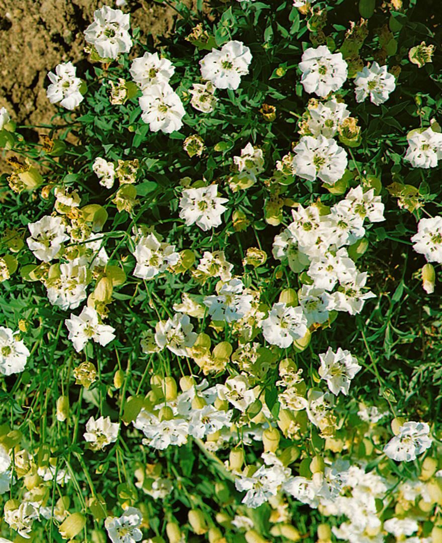 Kompakte polsterbildende Silene uniflora Weisskehlchen mit reinweissen Blueten und graugruenem Laub Bluetezeit Mai bis Juli