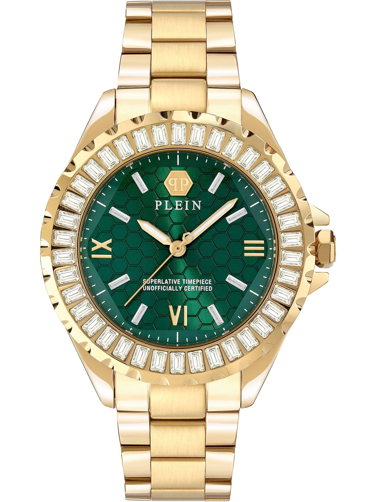 Mit Philipp Plein Uhren trägst du Luxus pur am Handgelenk. Diese Zeitmesser kombinieren mutige Designs mit exklusiven Materialien und sorgen dafür, dass du immer im Mittelpunkt stehst. Ein echter Hingucker für alle, die gerne aus der Masse herausstechen. Ein sportlich-eleganter Klassiker ist diese Damenuhr mit Edelstahl-Gehäuse an einem unkomplizierten Edelstahl-Band. Die High-Conic $Kull Spikes Lady von Philipp Plein kommt in Gelbgold daher, wozu das grüne Ziffernblatt besonders gut aussieht. Passt an schmale Handgelenke ebenso gut wie an breitere: Das runde Gehäuse mit 38 mm Durchmesser ist ein echter Allrounder. Ein Mineralglas bietet eine klare Sicht auf das Ziffernblatt und guten Schutz gegen alle Einflüsse, die bei normalem Gebrauch entstehen. Dank einer Wasserdichte von bis zu 5 Bar kann dieser Zeitmesser unbesorgt beim Händewaschen und Baden am Handgelenk bleiben. Die Butterfly-Faltschließe garantiert sowohl leichtes Anlegen als auch sicheren Halt am Arm. Kurzum: Die Philipp Plein High-Conic $Kull Spikes Lady Damenuhr ist besonders chic und präzise gefertigt – die perfekte Wahl für alle, die ein zuverlässiges Fashion-Statement fürs Handgelenk suchen.