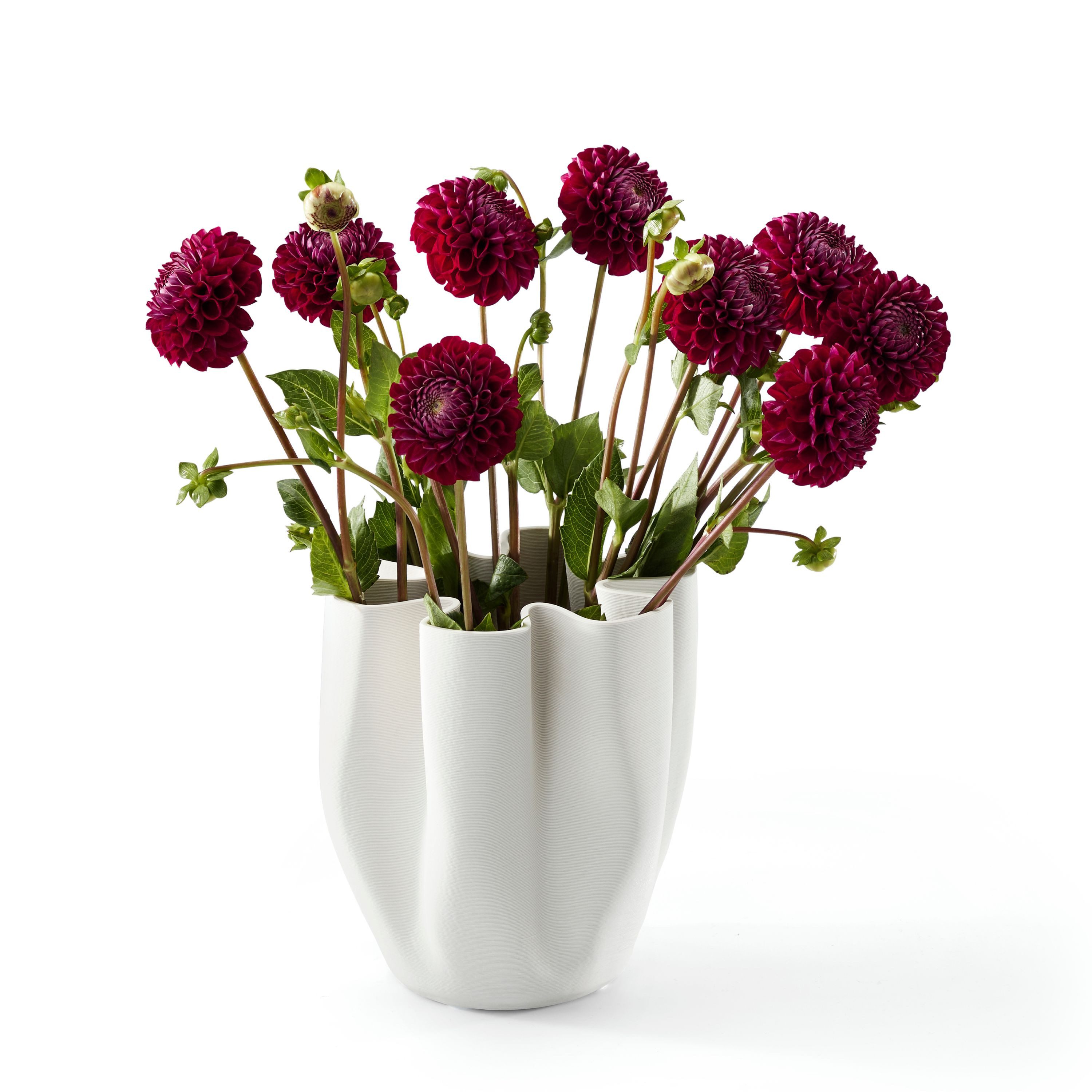LIVREE ist der aufregendste Beweis dafür, dass moderne Technik und Tradition keinesfalls im Widerspruch stehen. Die wunderschön organisch geschwungene, in Faltenstruktur designte Keramikvase von PHILIPPI wurde im modernen 3D-Druckverfahren aufgebaut und anschließend für ca. drei Stunden bei 1.200°C im Ofen gebrannt. Der wellenförmige Look der innovativen Blumenvase bietet jede Menge Spielraum für kreative Blumenarrangements und Dekorationen â“ Blumen, wie beispielsweise Tulpen, die in der Regel ohne zusätzliches Grün auskommen, fühlen sich hier besonders wohl. Ihre einzigartig feine Struktur in natürlichem Cremeweiß ist innen mit einer wasserdichten Beschichtung noch einmal zusätzlich bis auf die halbe Höhe verschlossen.
