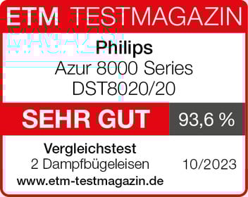 Das Philips Azur 8000 Series DST8020/20 erzielt im Vergleichstest des „ETM TESTMAGAZINS“ mit einem weiteren Dampfbügeleisen das Gesamtergebnis „sehr gut (93,6 %)“. Das Bügelergebnis ist „sehr gut“: Es glänzt auf jeglichen getesteten Textilien. Das Gerät ist sehr leicht zu handhaben. Außerdem ist es „gut“ ausgestattet und hochwertig verarbeitet. Insgesamt erreicht das Dampfbügeleisen im Test Platz zwei.