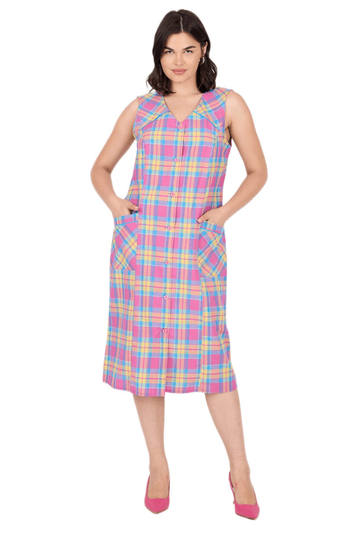 Damen-Arbeitskleid aus 65% Polyester und 35% Baumwolle mit kariertem Design Dieses elegante Arbeitskleid besteht aus hochwertigem, ipfadengefärbtem, kariertem Gewebe, das durch seine besondere Farbtiefe und Struktur besticht. Die Kombination aus Polyester und Baumwolle sorgt für Strapazierfähigkeit und angenehmen Tragekomfort – ideal für den täglichen Gebrauch. Modische Akzente – Durchgehende Knopfleiste und kontrastierende Paspeln Das Kleid verfügt über eine komplett durchgehende Knopfleiste vorne sowie unifarbene Paspeln an Schultern und Taschen, die dem Design eine stilvolle und moderne Note verleihen. Der kurze Gürtel am Rücken sorgt für eine perfekte Passform und betont die weibliche Silhouette. Pflegeleicht und langlebig – Waschbar bei 40 Grad Das robuste Material ist bei 40 Grad maschinenwaschbar und bleibt auch nach mehreren Waschgängen form- und farbbeständig. Dieses Kleid ist die ideale Wahl für Frauen, die Wert auf Komfort, Stil und einfache Pflege legen.