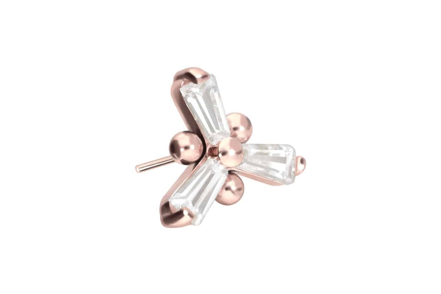 Dieser einzigartige Push Pin Aufsatz in Form einer funkelnden Kristallblume wurde speziell für unsere Push Fit Piercings entwickelt und besteht aus hochwertigem Titan, das sich unter anderem durch gute Hautverträglichkeit, Farbechtheit und hohe Beständigkeit auszeichnet. Ebenfalls zu seinen spezifischen Materialeigenschaften gehört Farbechtheit, die sowohl bei der silberfarbenen als auch bei der schwarzen, gold- und roségoldfarbenen Варіанти mit PVD-Beschichtung gewährleistet wird. Zum Einsetzen muss der Pin nach Belieben gebogen werden. Es ist zu beachten, dass ein festerer Halt gewährleistet ist, wenn der Pin ein bisschen stärker gebogen wird. Darüber hinaus ist der Push Pin des Aufsatzes mit all unseren Push Fit Produkten kompatibel, sodass sich vielfältige Kombinationsmöglichkeiten ergeben.