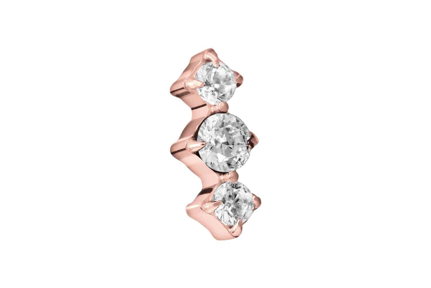 Dieser zeitlos schöne Schraubaufsatz in Form von drei Kristallen mit Fassungen wurde speziell für unsere Innengewinde-Piercings entwickelt und besteht aus hochwertigem Titan, das sich unter anderem durch gute Hautverträglichkeit und hohe Beständigkeit auszeichnet. Ebenfalls zu seinen spezifischen Materialeigenschaften gehört Farbechtheit, die sowohl bei der silberfarbenen als auch bei der schwarzen, gold- und roségoldfarbenen Варіанти mit PVD-Beschichtung gewährleistet wird. Das 0,9 mm starke Außengewinde des Aufsatzes ist mit all unseren Produkten, die über ein solches Innengewinde verfügen, kompatibel, sodass sich vielfältige Kombinationsmöglichkeiten ergeben.