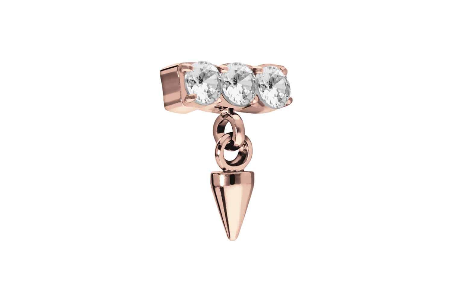 Dieser zeitlos schöne Schraubaufsatz in Form eines funkelnden Kristallbalkens, an welchem eine Spitze befestigt ist, wurde speziell für unsere Innengewinde-Piercings entwickelt. Seine Fassung besteht aus hochwertigem Titan, das sich unter anderem durch gute Hautverträglichkeit und hohe Beständigkeit auszeichnet. Ebenfalls zu dessen spezifischen Materialeigenschaften gehört Farbechtheit, die sowohl bei der silberfarbenen als auch bei der schwarzen, gold- und roségoldfarbenen Варіанти mit PVD-Beschichtung gewährleistet wird. Das 0,9 mm starke Außengewinde des Aufsatzes ist mit all unseren Produkten, die über ein solches Innengewinde verfügen, kompatibel, sodass sich vielfältige Kombinationsmöglichkeiten ergeben.