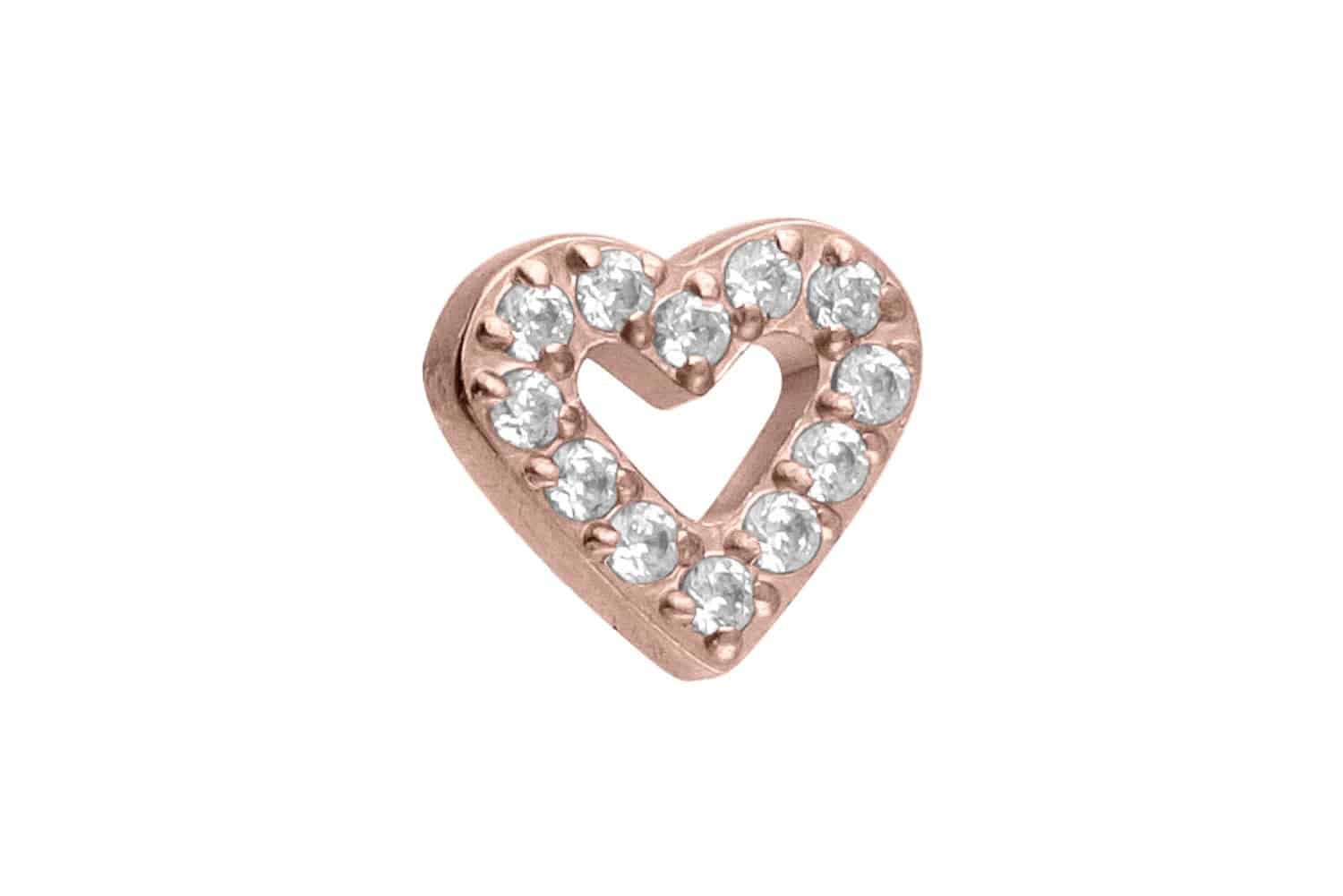 Dieser zeitlos schöne Schraubaufsatz in Form eines funkelnden Kristallherzens wurde speziell für unsere Innengewinde-Piercings entwickelt und besteht aus hochwertigem Titan, das sich unter anderem durch gute Hautverträglichkeit und hohe Beständigkeit auszeichnet. Ebenfalls zu seinen spezifischen Materialeigenschaften gehört Farbechtheit, die sowohl bei der silberfarbenen als auch bei der schwarzen, gold- und roségoldfarbenen Варіанти mit PVD-Beschichtung gewährleistet wird. Das 0,9 mm starke Außengewinde des Aufsatzes ist mit all unseren Produkten, die über ein solches Innengewinde verfügen, kompatibel, sodass sich vielfältige Kombinationsmöglichkeiten ergeben.