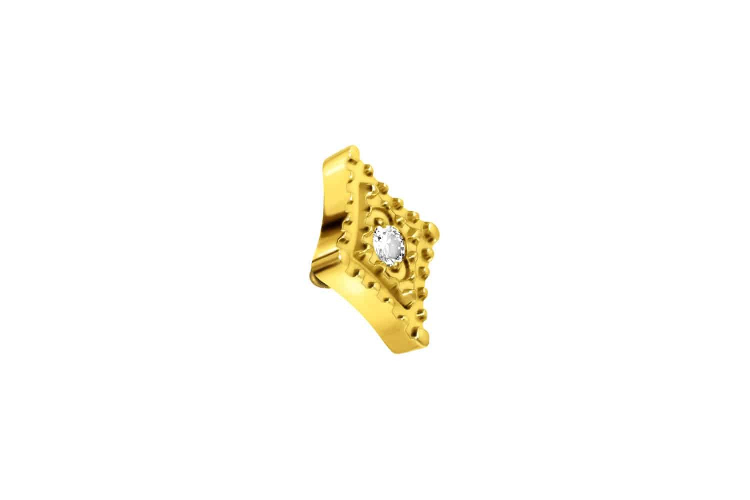 Dieser zeitlos schöne Schraubaufsatz in Form einer Raute mit Kristall wurde speziell für unsere Innengewinde-Piercings entwickelt und besteht aus hochwertigem Titan, das sich unter anderem durch gute Hautverträglichkeit und hohe Beständigkeit auszeichnet. Ebenfalls zu seinen spezifischen Materialeigenschaften gehört Farbechtheit, die sowohl bei der silberfarbenen als auch bei der schwarzen, gold- und roségoldfarbenen Варіанти mit PVD-Beschichtung gewährleistet wird. Das 0,9 mm starke Außengewinde des Aufsatzes ist mit all unseren Produkten, die über ein solches Innengewinde verfügen, kompatibel, sodass sich vielfältige Kombinationsmöglichkeiten ergeben.