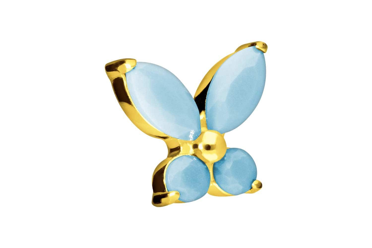 Dieser zeitlos schöne Schraubaufsatz in Form eines Schmetterlings, dessen Flügel aus synthetischen Türkisen bestehen, wurde speziell für unsere Innengewinde-Piercings entwickelt und besteht aus hochwertigem Titan, das sich unter anderem durch gute Hautverträglichkeit und hohe Beständigkeit auszeichnet. Ebenfalls zu seinen spezifischen Materialeigenschaften gehört Farbechtheit, die sowohl bei der silberfarbenen als auch bei der schwarzen, gold- und roségoldfarbenen Варіанти mit PVD-Beschichtung gewährleistet wird. Das 0,9 mm starke Außengewinde des Aufsatzes ist mit all unseren Produkten, die über ein solches Innengewinde verfügen, kompatibel, sodass sich vielfältige Kombinationsmöglichkeiten ergeben.
