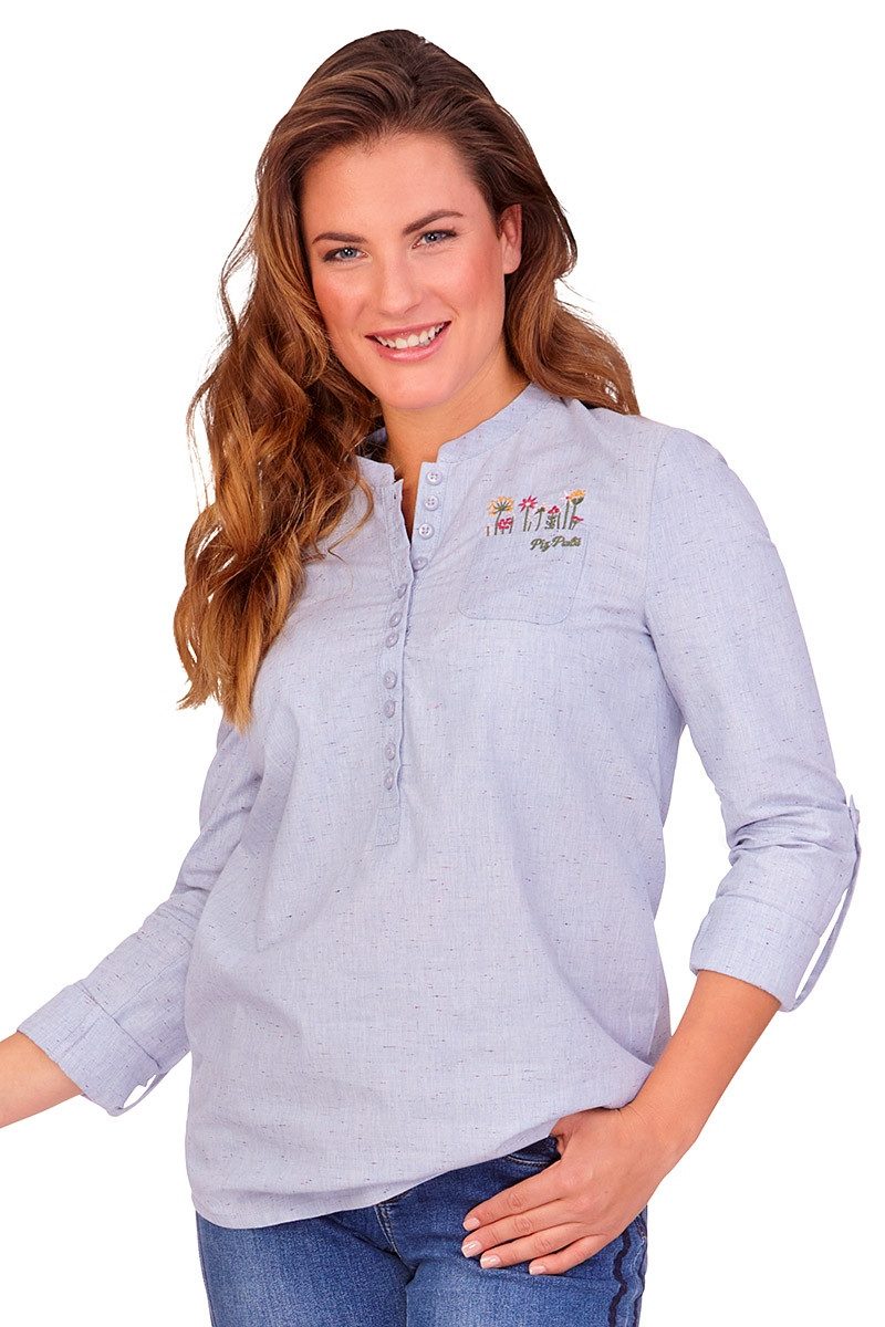 Die verlockende, leicht taillierte Damenbluse Balzhausen im Tunika-Stil besteht fast ausschließlich aus angenehmer Baumwolle und hat eine leichte, feine Stoffqualität. Beide Farbvarianten sind allover mit zarten, farbigen Fäden durchwirkt und die himmelblaue Варіанти hat zudem einen dezenten Frosted Effect-Look. Der schmale Stehkragen ist leicht verstärkt und es gibt eine Knopfleiste vorn mit niedlichen, schimmernden Knöpfen, die farblich zum Blusenstoff passen. Die links aufgesetzte Brusttasche mit gesticktem Markennamen zieren entzückende, gestickte Blumensträußchen aus Blumen in verschiedenen Farben und Formen, die aus der Tasche heraus schauen. Optimal für den Sommer lassen sich die langen Ärmel mit den dezent verstärkten Manschetten und umsäumten Ärmelschlitzen per Riegel und Knopf zu Krempelärmeln umfunktionieren. Die herrliche Damen Schlupfbluse passt wunderbar zu Lederhose sowie Trachtenjeans und ist für viele Gelegenheiten passend. Bitte beachten Sie den Größenzuschlag bei Розмір 48.