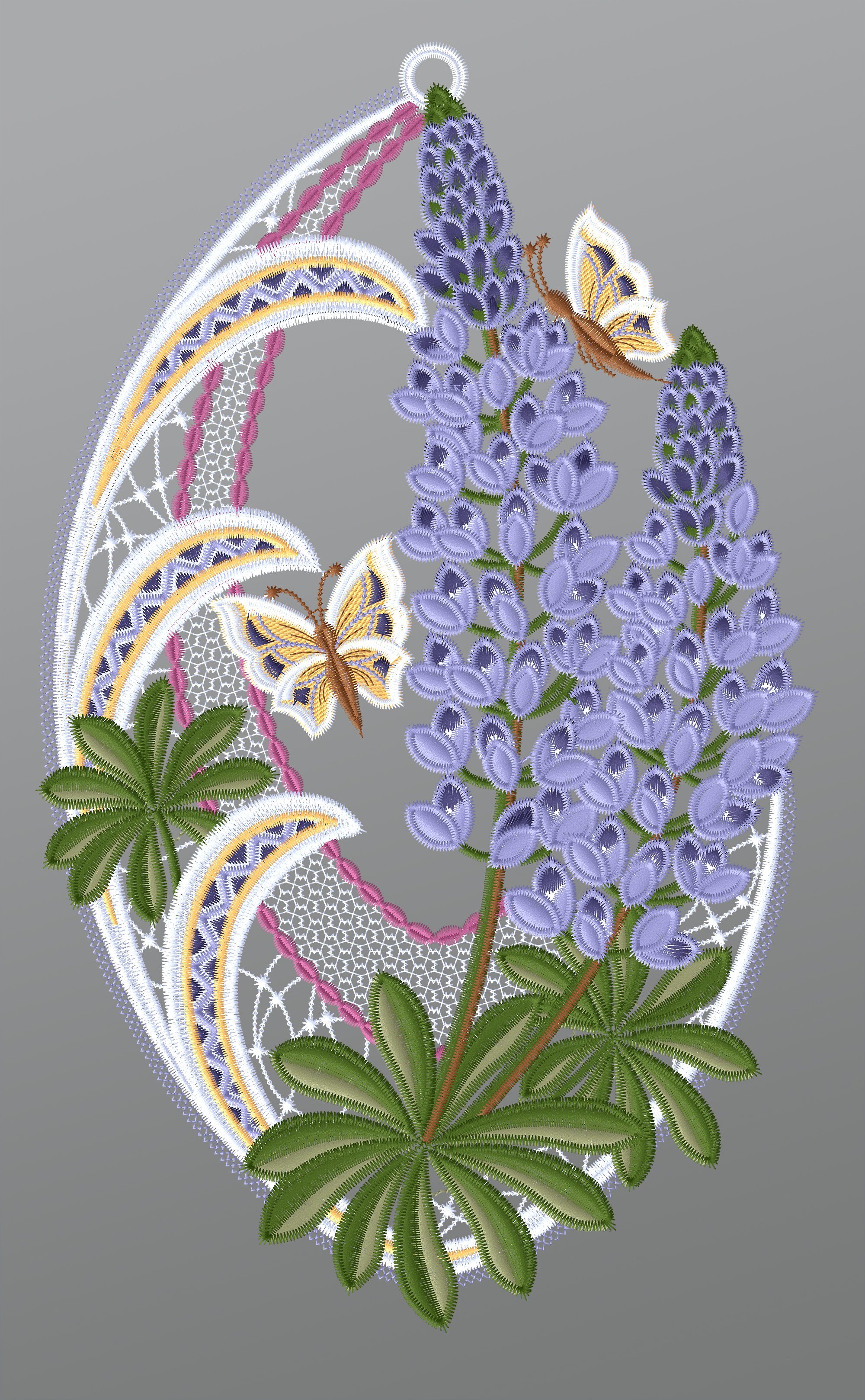 Eingebettet in ein halbmondförmiges Gebilde mit geschwungenen, blätterähnlichen Formen sind die beiden Lupinen der Blickfang dieses Fensterbildes aus Plauener Spitze®. Die Blätter erinnern hier fast an Palmen; das gesamte Fensterbild bekommt durch die halbmondförmigen und geschwungenen Formen einen orientalisch angehauchten Touch. Der Mustermix aus feinem und grobem Fadengeflecht sowie gezacktem Design lässt das Fensterbild abwechslungsreich und lebendig wirken. Während sich ein Schmetterling bereits auf der großen Lupine niedergelassen hat, flattert der andere noch fröhlich umher und stellt sein prachtvolles Muster zur Schau. Das Fensterbild mit Blumenmotiv besteht zu 100 % aus Polyester und lässt sich schonend bei 30 Grad per Hand waschen..
