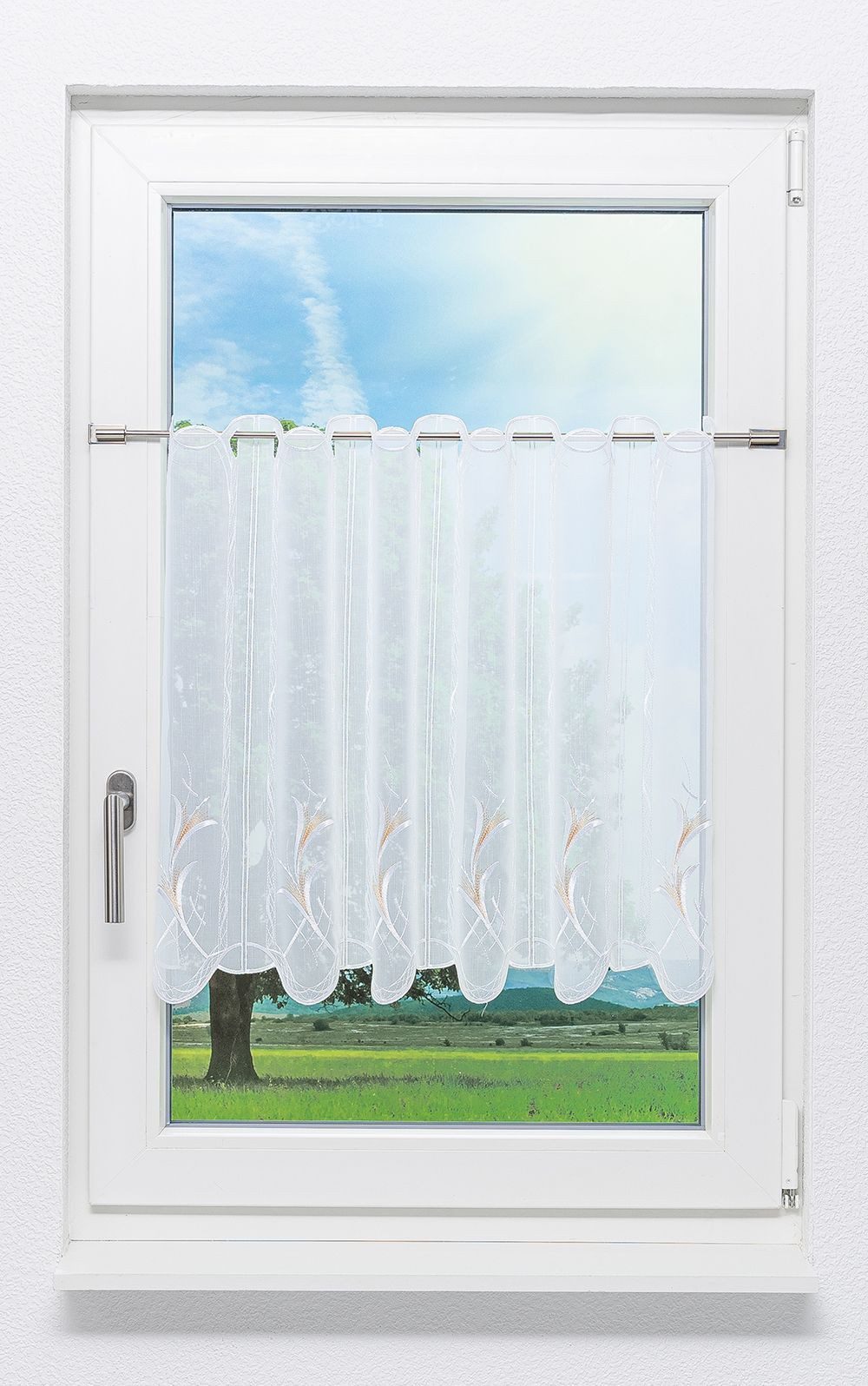 Eine kunstvolle florale Musterung, die im Einklang mit einer besonders raffinierten Einfassung steht, verleihen dieser Scheibengardine Eleganz und eine flexible Verwendbarkeit, die nicht an einen konkreten Einrichtungsstil gebunden ist. Ein wellenartiges Muster zieht sich beidseitig durch die Stoffbahnen. Am oberen Rand bildet es eine Art bogenförmiges Dach. Aus dem unteren, nicht minder schwungvoll gestalteten Saum lässt es Blumenkelche empor wachsen. Die Blüten sind äußerst filigran gestaltet. Sie animieren das Auge, auf Entdeckungsreise zu gehen und die Fantasie schweifen zu lassen. Die Transparenz des weißen Grundmaterials aus 100 % Polyester unterstreicht den natürlich-frischen Eindruck, den die Scheibengardine am Wohn- und Schlafzimmerfenster oder in Ihrer Küche hinterlässt. Mit seinem praktischen Stabdurchzug lässt sich der Behang in wenigen Handgriffen am Fenster befestigen. Gereinigt wird er mit der Maschine bei 30°C im Schonwaschgang..