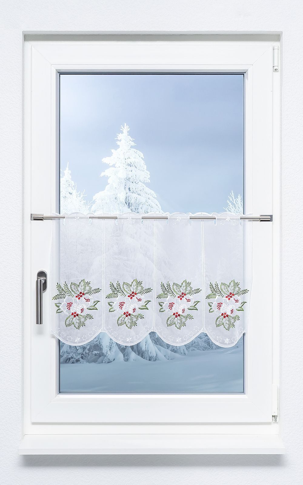 Weihnachtliche Dekoration gelingt im Handumdrehen mit dieser zeitlosen Scheibengardine aus Plauener Spitze®. Zarte Christrosenblüten erinnern an das nahende Fest und lassen auch an tristen Wintertagen die schlummernde Natur ein wenig aus dem Winterschlaf erwachen. Zu sehen sind die weißen Blüten hier in der Kombination mit den Blättern und roten Beeren der Stechpalme. Die Spitzengardine ist in verschiedenen Breiten in Rapportschritten von 16.40 cm erhältlich. Gegen leichte Verschmutzungen hilft Handwäsche bei 30°C...