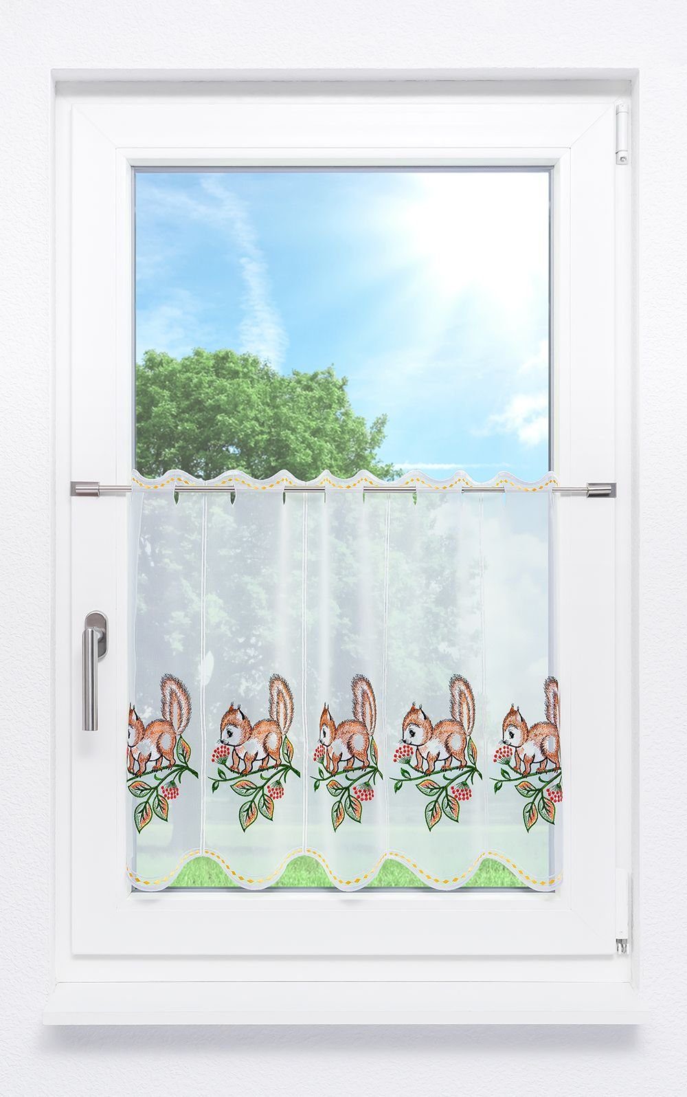 Ein Eichhörnchen ist der Blickfang auf dieser Scheibengardine. Der kleine Nager ist wohl auf der Suche nach Nüssen. Schließlich ist es Zeit sich einen Wintervorrat anzulegen. Sehr farbenfroh, in herbstlichen Tönen gehalten, dürfte Ihnen diese zauberhafte Gardine aus Plauener Spitze® an tristen Novembertagen ein Lächeln ins Gesicht zaubern. Eine schöne Fensterdekoration fürs Kinderzimmer, die in unterschiedlichen Breiten und Höhen erhältlich ist und die übers ganze Jahr hinaus das Fenster schmücken kann. Der Polyesterstoff ist halbtransparent verarbeitet, lässt in der Regel fast alles Tageslicht durch, während gleichzeitig ein gewisser Sichtschutz besteht. Reinigen lässt sich der Behang im Schonwaschgang der Maschine bei 30°C...