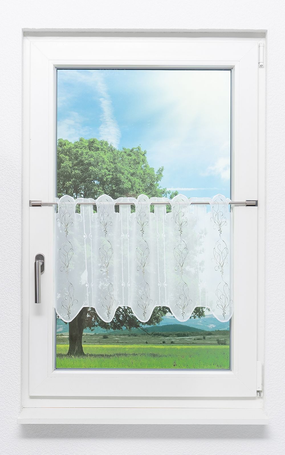 Eine ganz toll gearbeitete Scheibengardine aus Plauener Spitze®, welche nicht nur durch ihre dezente Musterung besticht, sondern auch durch die außergewöhnlichen Abschlüsse am oberen und unteren Rand. Das raffiniert gestaltete Schnörkelmotiv zieht sich mittig und in regelmäßigem Abstand durch den weißen Stoffhintergrund. Weiße Nähte trennen die einzelnen Segmente voneinander. Für die individuelle Anpassung an Ihre Fenstergröße sollten Sie die Rapportbreite von 16,4 cm beachten. Das hübsche Design lässt der Fantasie freien Lauf. Es erinnert an züngelnde Flammen, aber auch an Schlingpflanzen. Mit dieser unaufgeregten Ausstrahlung passt der Behang sowohl ins Wohnzimmer wie als dekorativer Fensterschmuck in den Schlafbereich. Sie kreieren damit einen optisch individuellen Wohn-Look in Kombination mit angenehmen Lichtverhältnissen. Vor neugierigen Blicken aus der Nachbarschaft kann Sie der transparente Stoff zwar nur dezent schützen, dafür lässt er Ihre Räume heller und freundlicher erscheinen. Dank des Stabdurchzuges am oberen Abschluss lässt sich die Gardine in wenigen Handgriffen am Fenster befestigen. Zur Reinigung können Sie den Schonwaschgang der Maschine benutzen..