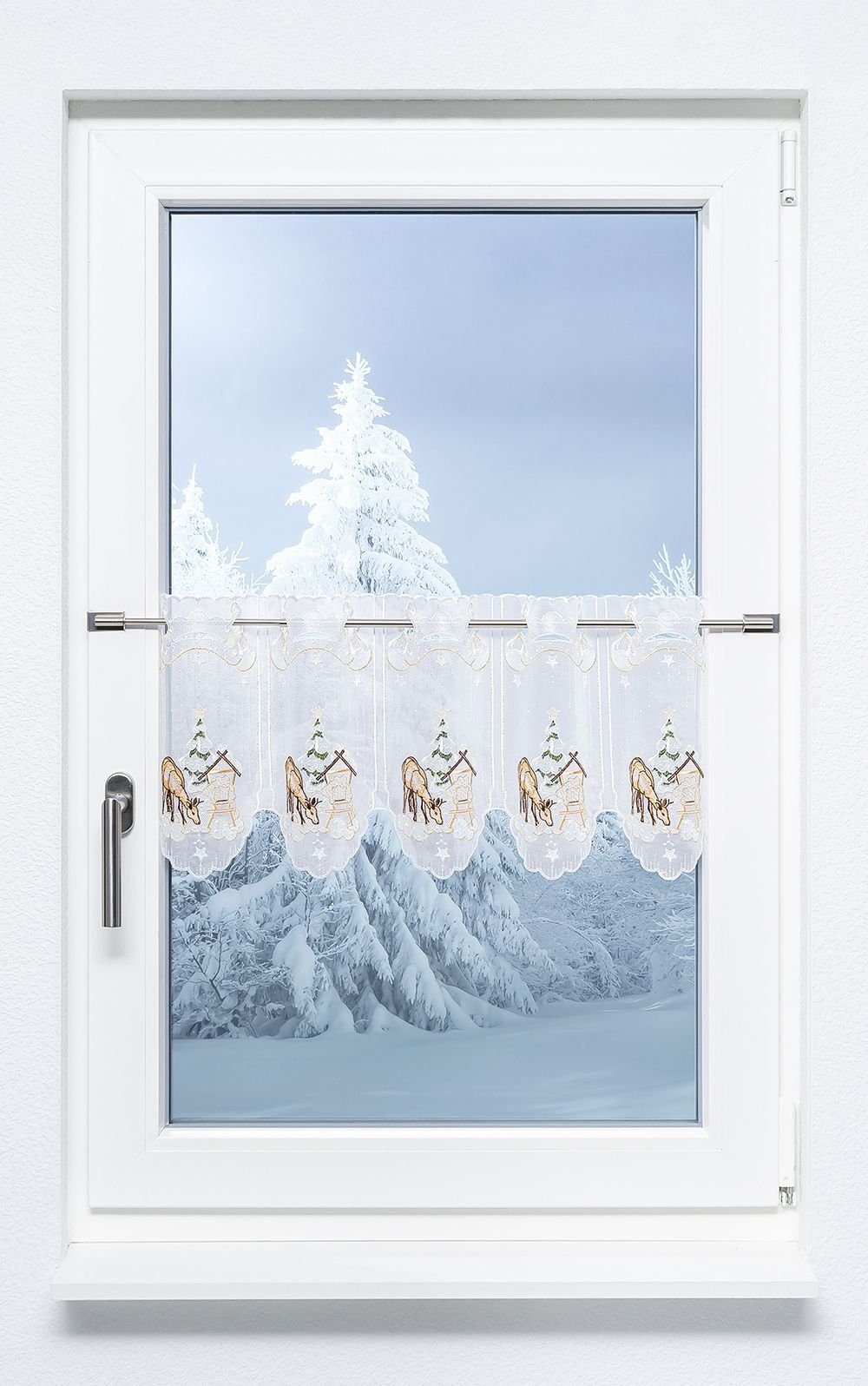 Sie mögen Ihre Weihnachtsdeko gern natürlich, dennoch etwas verspielt? Dann werfen Sie bitte mehr als nur einen Blick auf diese Scheibengardine aus Plauener Spitze®. Das Design basiert auf weißem Polyesterstoff, der am oberen Rand und in der Mitte von gestickten Wolken durchbrochen wird. Letztere sind fließend-weich gezeichnet und gliedern die Fläche angenehm auf. Sterne und Assoziationen von fallendem Schnee deuten sich an. Das Motiv im unteren Drittel des Behangs zeigt ein äsendes Reh vor einer Futterkrippe und einem verschneiten Weihnachtsbaum. Der schneebedeckte Boden spiegelt gekonnt das Wolkendesign wider, gibt dem Behang dadurch den passenden Abschluss. Die Höhe der Gardine verspricht gewissen Sichtschutz. Ansonsten profitieren selbst kleinste Räume von der freundlichen Transparenz des Gewebes. Der weihnachtliche Fensterschmuck eignet sich für klassische wie moderne Wohnzimmer, passt genauso gut aber auch in Küchen. Befestigt wird er mit praktischem Stangendurchzug..
