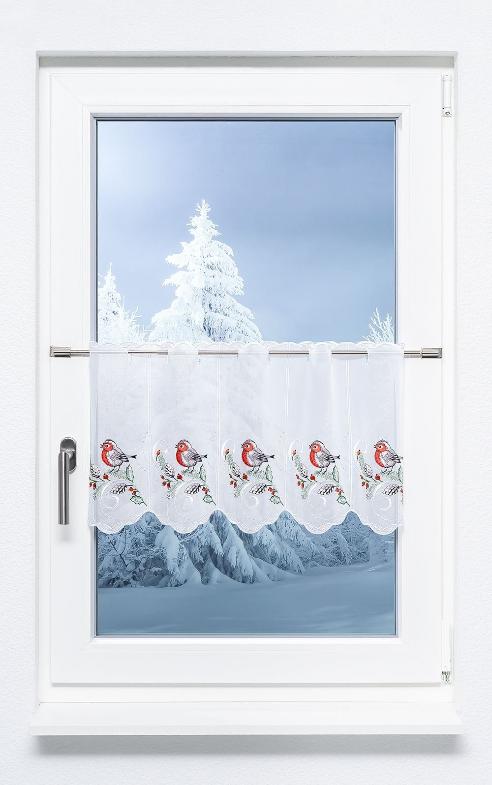 Diese detailreich geschmückte Scheibengardine mit Naturmotiv ist nicht nur in der Advents- und Weihnachtszeit eine geschmackvolle Zierde fürs Fenster. Der mit leichten Wellenformen gestaltete untere Abschluss lässt zarte und filigrane Stickereien erkennen, die am oberen Abschluss in ähnlicher Weise zu finden sind. Blickfang ist das Rotkehlchen auf dem Tannenzweig, wobei die geschwungenen Zierbänder Lebendigkeit und Dynamik in das Design bringen. Zapfen sowie die Stechpalmenblätter und -beeren sorgen für eine natürliche und gediegene Ausstrahlung. Per Stangendurchzug wird die Scheibengardine aus Plauener Spitze® am Fenster befestigt. Sie dient vor allem als Deko, der transparente Stoff bedeckt nicht einmal die Hälfte des Fensters und lässt viel Licht leicht gedämpft und gemildert in den Raum fallen. Das liebevolle Design dieses Modells macht es auch für Kinderzimmer passend..