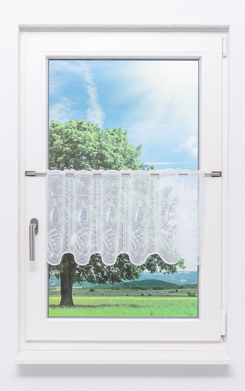 Eine sehr dezente und doch tolle Scheibengardine präsentiert sich Ihnen mit diesem transparenten Modell. Aus Plauener Spitze® gefertigt und wunderschön mit dezenten Rauten und Ranken bestickt, bekommen Sie einen Blickfang für sämtliche Bereiche des Wohnens. Das schwungvolle Design regt die Fantasie an und lässt viele Interpretationsmöglichkeiten offen. Toll sind auch die gebogten Abschlüsse, die am unteren Rand etwas großzügiger ausfallen als im oberen Bereich, wo sich die Cut Outs für den Stangendurchzug befinden. Auf diese Weise lässt sich der Behang in wenigen Handgriffen am Fenster dekorieren. Vitragestangen zum Klemmen oder Kleben in großer Auswahl finden Sie in unserem Zubehörsortiment. Der Polyesterstoff lässt ausreichend Licht durchs Fenster, bietet Ihnen durch seine Höhe gleichzeitig auch etwas Schutz vor neugierigen Blicken aus der Nachbarschaft. Ihr Gewebe ist pflegeleicht. Zum Reinigen können Sie den Schonwaschgang der Maschine benutzen..