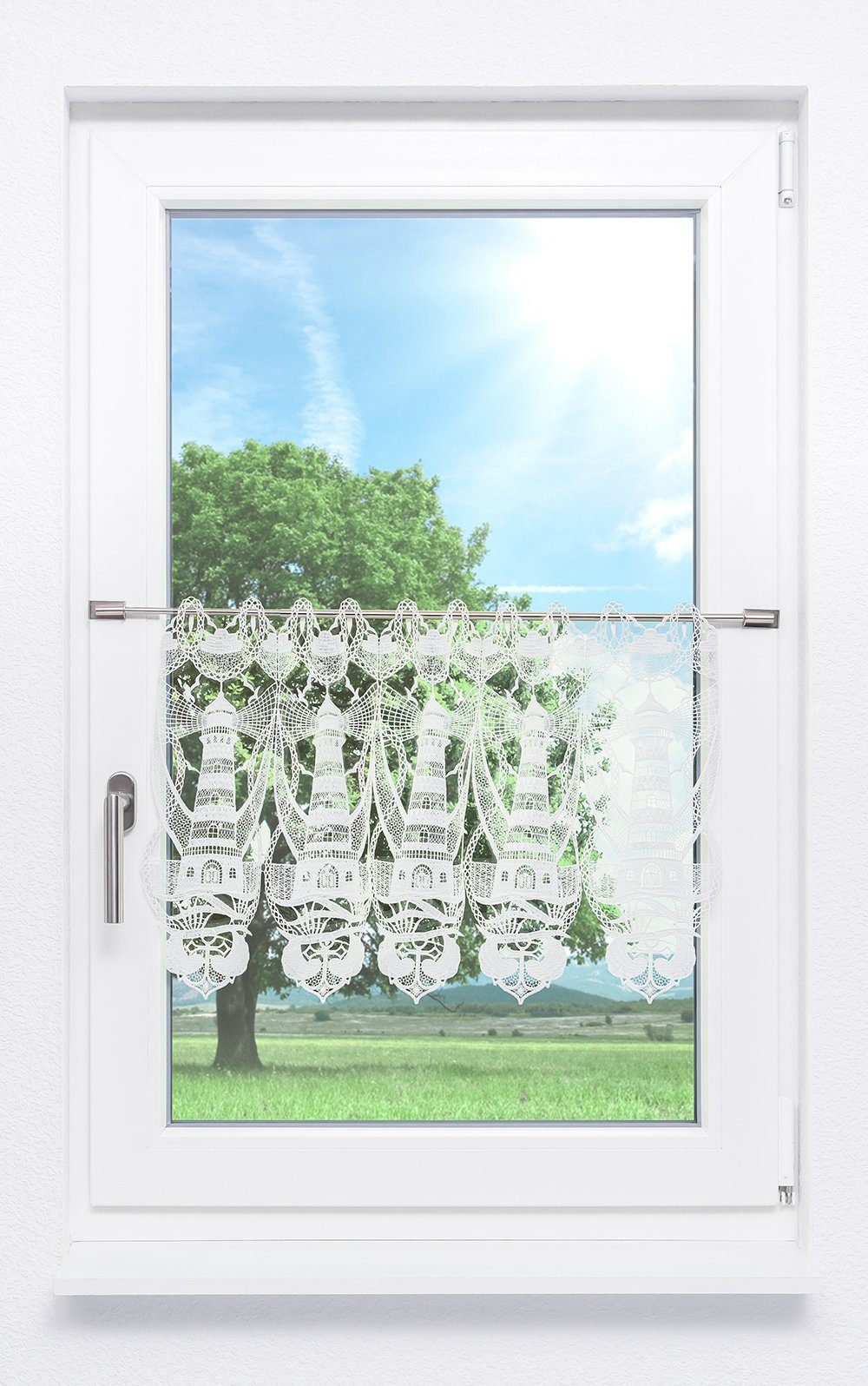 Sie mögen Meer und Wellen und sind auf der Suche nach einem Fensterschmuck, der diese Leidenschaft dekorativ zum Ausdruck bringt? Wie wäre es mit dieser extravaganten Scheibengardine aus Plauener Spitze®? Hier ist alles enthalten, was das maritime Herz begehrt und vom nächsten Urlaub an der Ostsee oder am Mittelmeer träumen lässt. Zentrales Motiv ist ein Leuchtturm, wie man ihn an vielen Küsten findet und dessen Leuchtfeuer hier besonders einfallsreich umgesetzt ist. Anker, Möwen, Wolken und Taue sind ebenfalls gekonnt in das Design integriert. Die Schlaufen der imaginären Seile am oberen Abschluss können für den Stangendurchzug genutzt werden. Die Transparenz des Polyesters unterstreicht den natürlich-frischen Eindruck. Verschmutzungen waschen Sie mit der Maschine im Schonwaschgang bei 30°C aus...