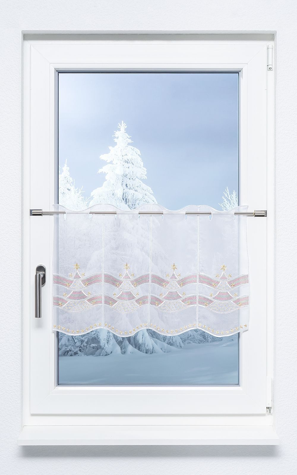 Es ist alles da, was man mit Weihnachten verbindet. Ein Tannenbaum, goldene Sterne, rote und grüne Farben ....und doch erscheint diese Gardine ganz unkonventionell und modern.Die Spitzengardine ist in verschiedenen Breiten in Rapportschritten von 16.30 cm erhältlich. Gegen leichte Verschmutzungen hilft Handwäsche bei 30°C...