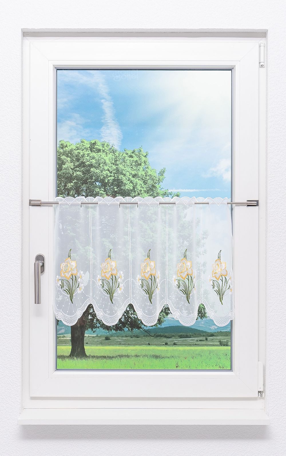 Die goldgelben Blüten der Narzissen bringen mit ihrer leuchtenden Farbe die Sonne in den oft noch winterfahlen Garten. Da sie meist zur Osterzeit herum blüht, wird sie auch einfach Osterglocke genannt. In Kombination mit kleinen Primeln und grünen Blättern heißt sie auf dieser Gardine auch bei Ihnen zu Hause den Frühling willkommen. Schwungvolle Wellen an Ober- und Unterkanten runden das Bild dieser erfrischenden und zugleich unaufdringlichen Musterung ab...