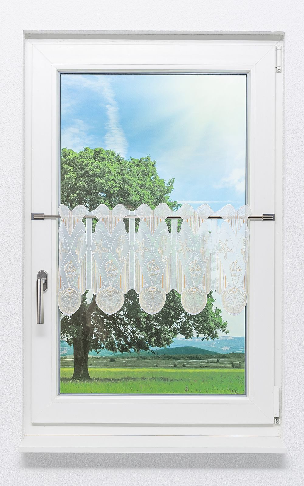 Sie mögen die Kombination aus natürlichen Motiven und klassischem Muster? Dann schauen Sie sich diese Scheibengardine doch etwas genauer an. Als Basis für das gestickte Design aus Plauener Spitze® dient weißer Polyesterstoff. Von diesem schlicht-zarten Untergrund hebt sich sporadisch ein vertikales Muster aus variierenden, farbigen Streifen ab, was von Meerestieren mittig ergänzt wird. Seesterne, Muscheln und Seepferdchen sind in derselben Optik gehalten. Oben und unten schließt der Saum mit einer prächtigen Jakobsmuschel ab. Das Wechselspiel aus maritimen Motiven und Streifen geht mit dem weißen Hintergrund einen hübschen Kontrast ein und sorgt so für eine attraktive Dynamik. Er eignet sich als Ergänzung von modernen Einrichtungsstilen, klassische Wohnumgebungen können ebenso von der Transparenz des Gardinenstoffes profitieren. Er ermöglicht reizvolle Effekte und lässt selbst kleinste Räume hell und freundlich wirken. Die Befestigung ist kinderleicht und erfolgt mit Stangendurchzug am oberen Abschluss..