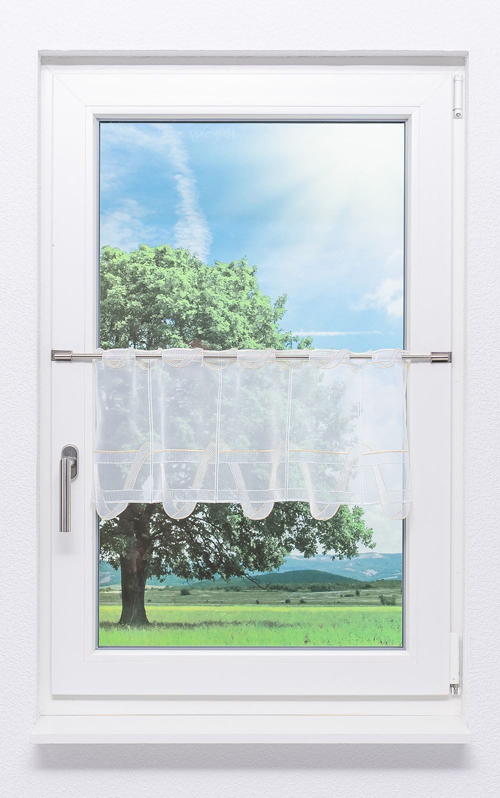 Ganz unkonventionell präsentiert sich die Scheibengardine mit Plauener Stickerei. Das moderne Muster eignet sich besonders für junge Wohneinrichtungen. Eine Wellenlinie in weiß und zartem Beige verbindet 2 waagerechte Streifen und wird gleichzeitig zum schwungvollen Abschluss dieser Gardine. In der Lochkante für den Stangendurchschub findet sich dieses Motiv wieder...
