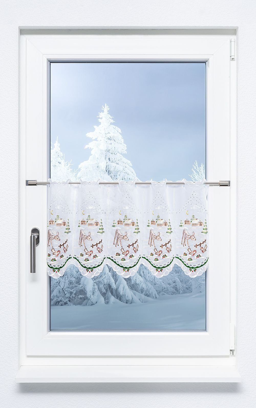 Eine harmonische Szenerie zeigt sich auf dieser zarten, halbtransparenten Scheibengardine: Ein neugieriges Reh und zwei kleine Vögelchen sind im Vordergrund der nächtlichen Winterlandschaft zu erkennen, während zwei Häuser sowie einige verschneite Nadelbäume den Hintergrund bilden. Der abgerundete untere Saum ist mit einer dunkelgrünen Borte sowie kleineren Stechpalmenblättern und -beeren verziert. Im oberen Abschluss befinden sich die Cut Outs für den Stangendurchzug. Damit lässt sich die Gardine bequem und völlig ohne Bohren anbringen. Wir empfehlen dafür eine Klemmstange, Pinnstange oder Vitragenstange, die sich allesamt einfach ins Fenster spannen lassen. Eine schöne Fensterdekoration, die in unterschiedlichen Breiten und Höhen erhältlich ist und auch über die Weihnachtszeit hinaus die Scheibe schmücken kann. Je nach gewählter Höhe bedeckt das Polyestergewebe kaum die Hälfte der Glasfront, lässt dadurch viel Licht hindurch und bietet tagsüber einen leichten Sichtschutz...