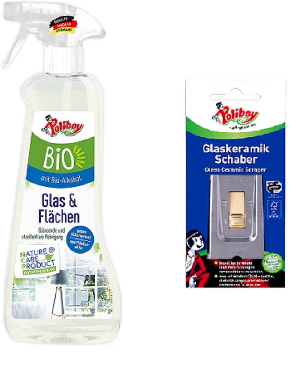 Poliboy Bio Glasreiniger 500 ml + Glaskeramik Schaber für eine glänzende und streifenfreie Reinigung von spiegelnden Oberflächen Glasreiniger & Flächenreiniger 500 ml Neben pflanzlichen Zuckertensiden aus Kokosöl und Glucose werden hier auch besonders milde Tenside auf Aminosäurebasis verwendet, die ein besonders schonendes, aber zugleich kraftvolles Produkt ermöglichen. Da alle POLIBOYReiniger ausschließlich aus pflanzlichen und mineralischen Inhaltsstoffen und auch in der Verarbeitung der Rohstoffe keinen Kontakt mit tierischen Bestandteilen hat, können die Reiniger unbedenklich von Veganer verwendet werden. Es werden keinerlei synthetischen Lösemittel, Duft- oder Farbstoffe verwendet. Glaskeramik Schaber Der POLIBOY Schaber für Glaskeramik ist ein besonders hochwertiges Reinigungsgerät für alle glatten, harten Oberflächen, z.B. aus Glas, Glaskeramik oder Stein. Mit diesem Schaber können festsitzende Verschmutzungen und Verkrustungen auf allen Glaskeramikkochfeldern ohne Beschädigung der Oberfläche entfernt werden.