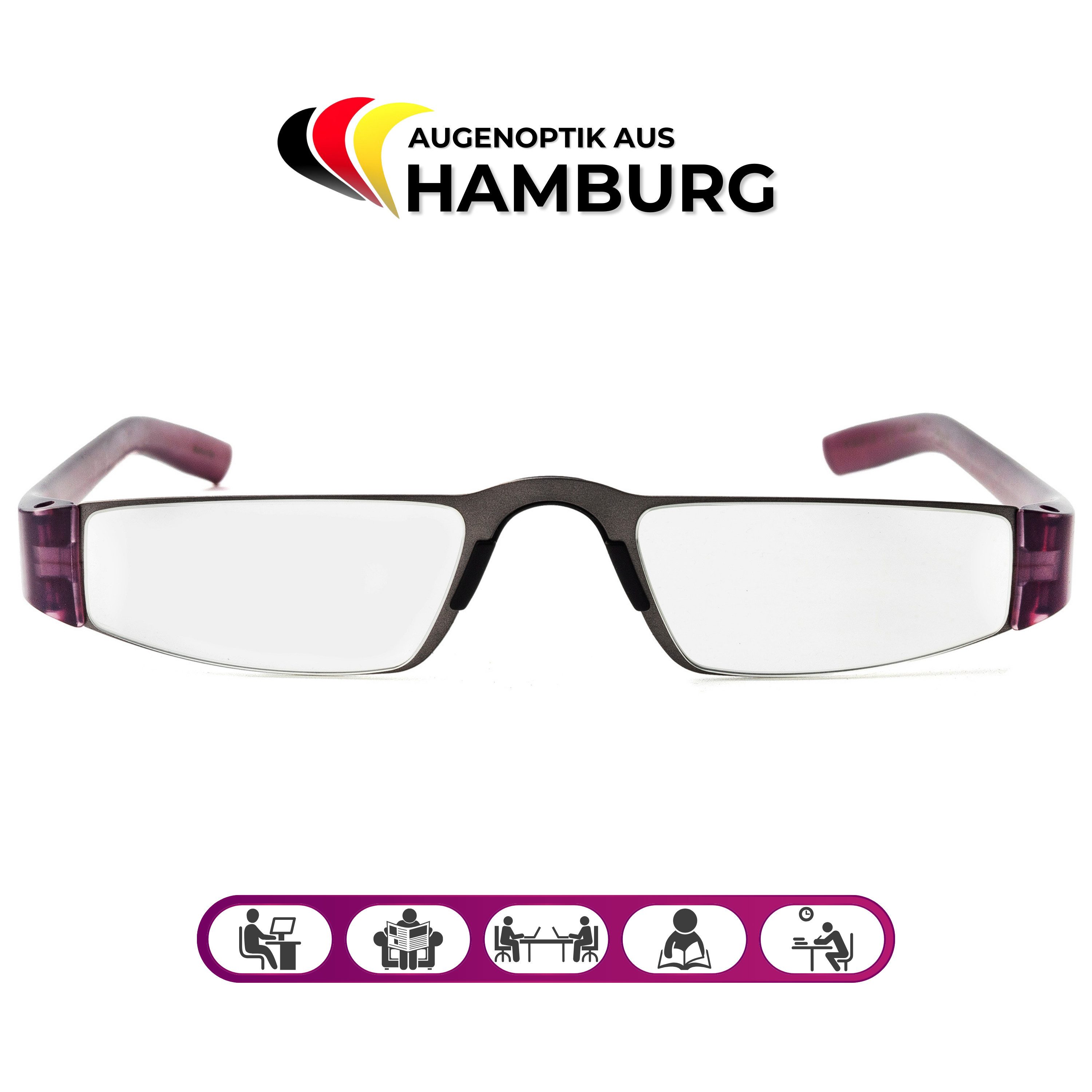 Die bruchsicheren, kratzfesten Kunststoffgläser ermöglichen entspanntes Lesen bei jeder Lichtbedingung und schützen die Augen zuverlässig vor UV-Strahlung. Die Brille ist in Dioptrienstärken von +1.0 bis +3.0 erhältlich – perfekt als stilvolle Lesehilfe für Alltag, Büro oder unterwegs.