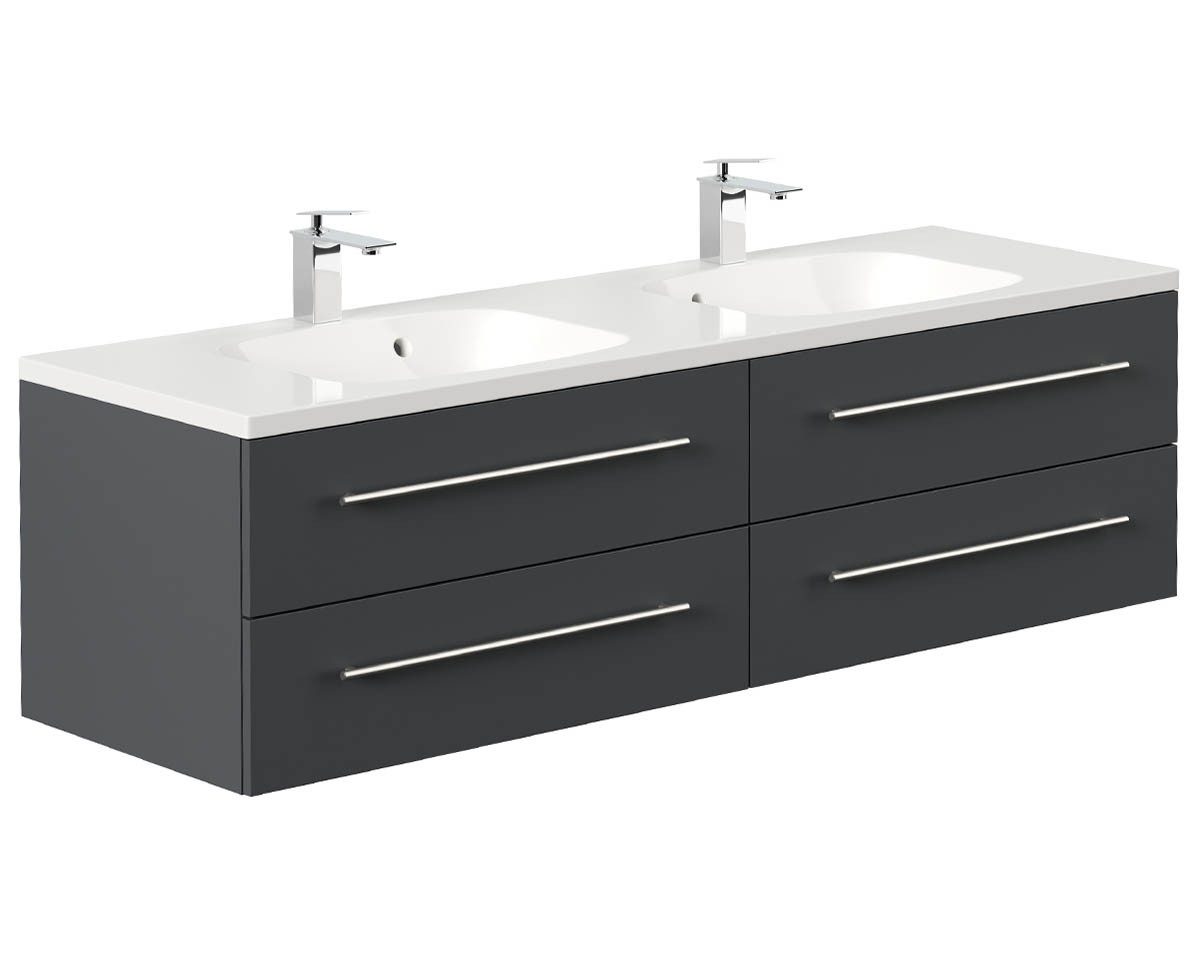 Zu zweit mehr Spaß im Bad! Optisch schmeichelnd fügt sich diese extra-geräumige Möbelserie ein in vorhandene Badelandschaften, oder bietet den soliden Möbel-Grundstein für eine komplette optische Neuausrichtung des Innendesigns. Die Qualitätsbeschichtung der Oberfläche sorgt nicht nur für ein schickes Finish der Möbel, sondern auch für eine optimale Versiegelung der Waschtische gegen Schmutz und Feuchtigkeit. Ausgestattet mit dem Anti-Fingerprint Effekt - keine Fingerabdrücke mehr dank supersofter Oberfläche!