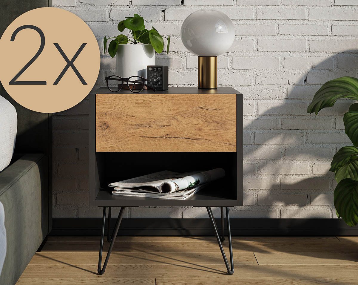 Der Industrial Nachttisch von Posseik kombiniert modernes Design mit praktischer Funktionalität. Der grafitgraue Softtouch-Korpus in Kombination mit täuschend echt wirkenden Eiche-Fronten verleihen dem Möbelstück eine elegante Optik, während die 20 cm hohen Metallfüße den angesagten Industrial-Stil unterstreichen.