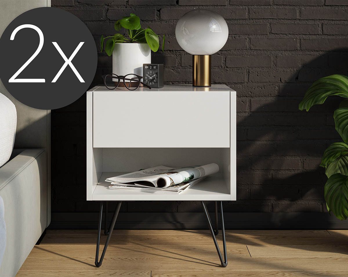 Das Industrial Nachtisch von Posseik kombiniert modernes Design mit praktischer Funktionalität. Die weißen Hochglanzfronten verleihen dem Möbelstück eine elegante Optik, während die 20 cm hohen Metallfüße den angesagten Industrial-Stil unterstreichen.
